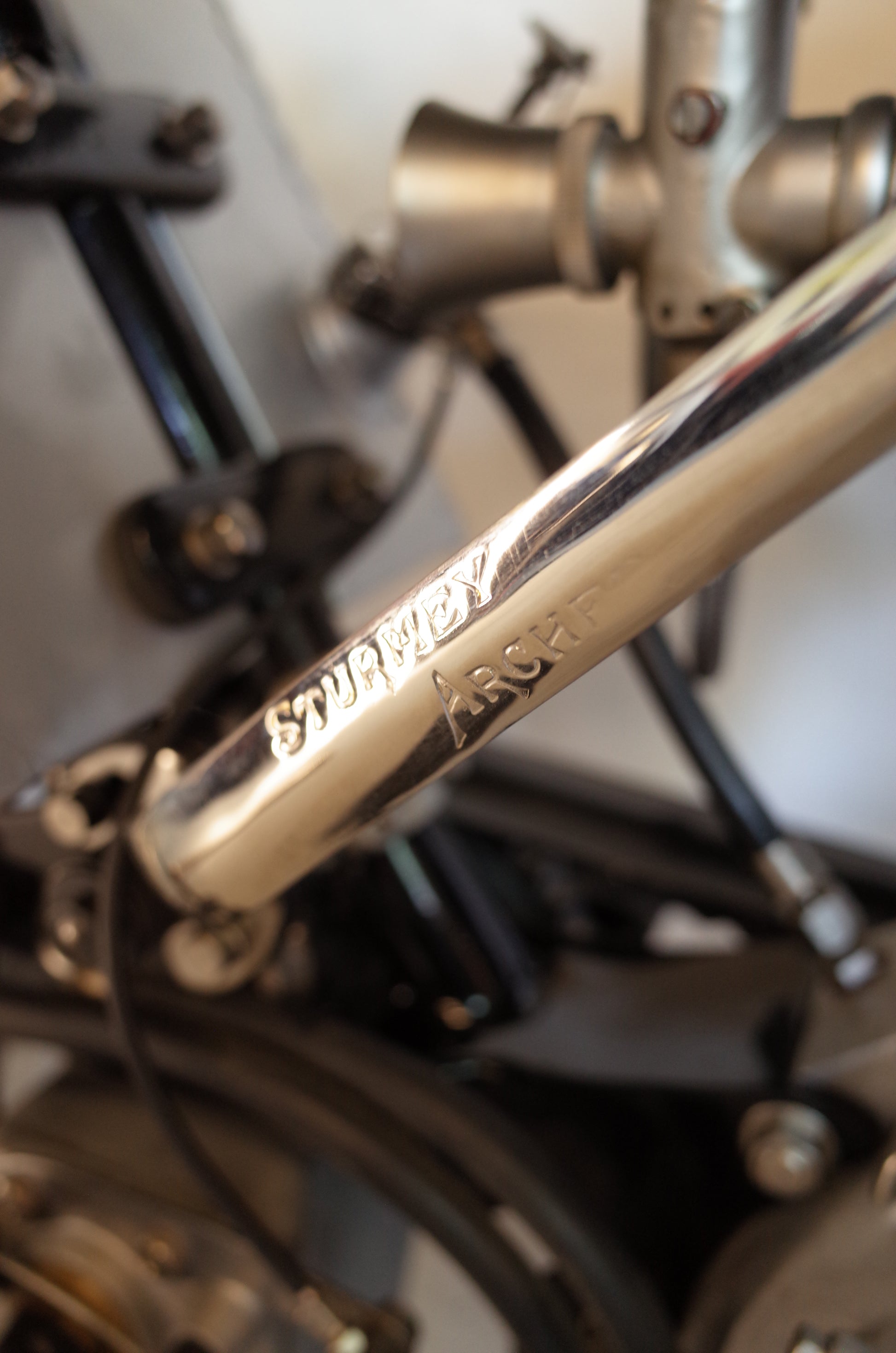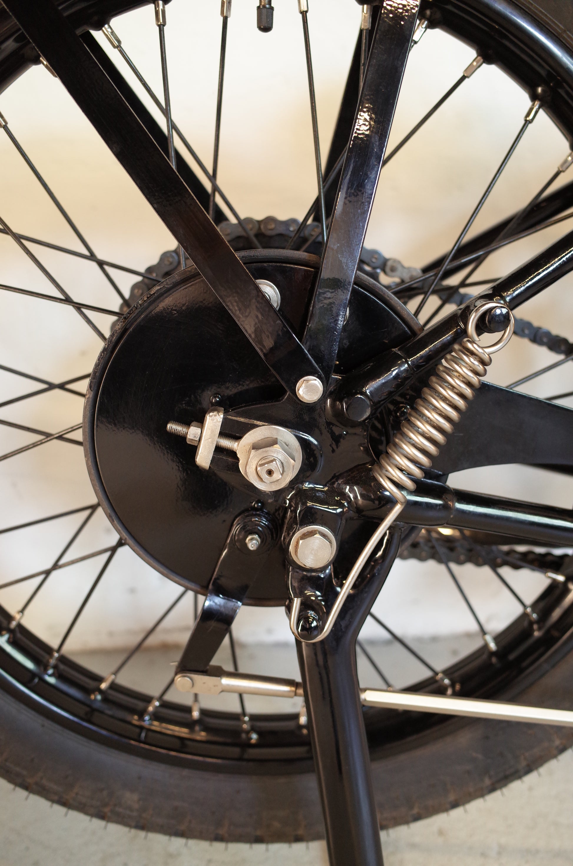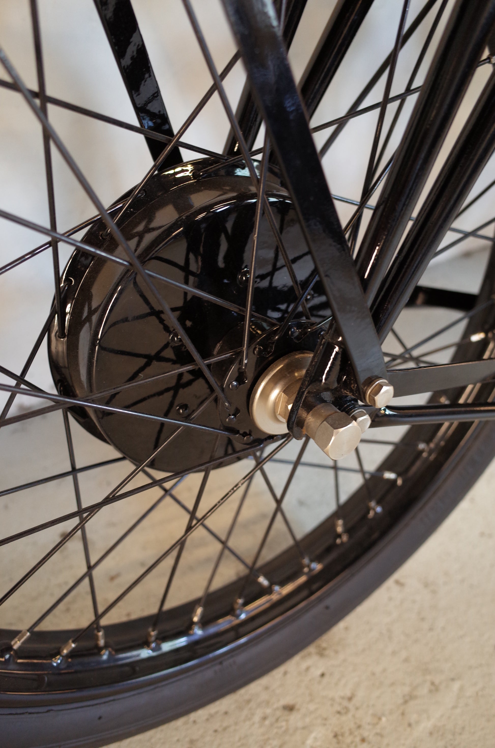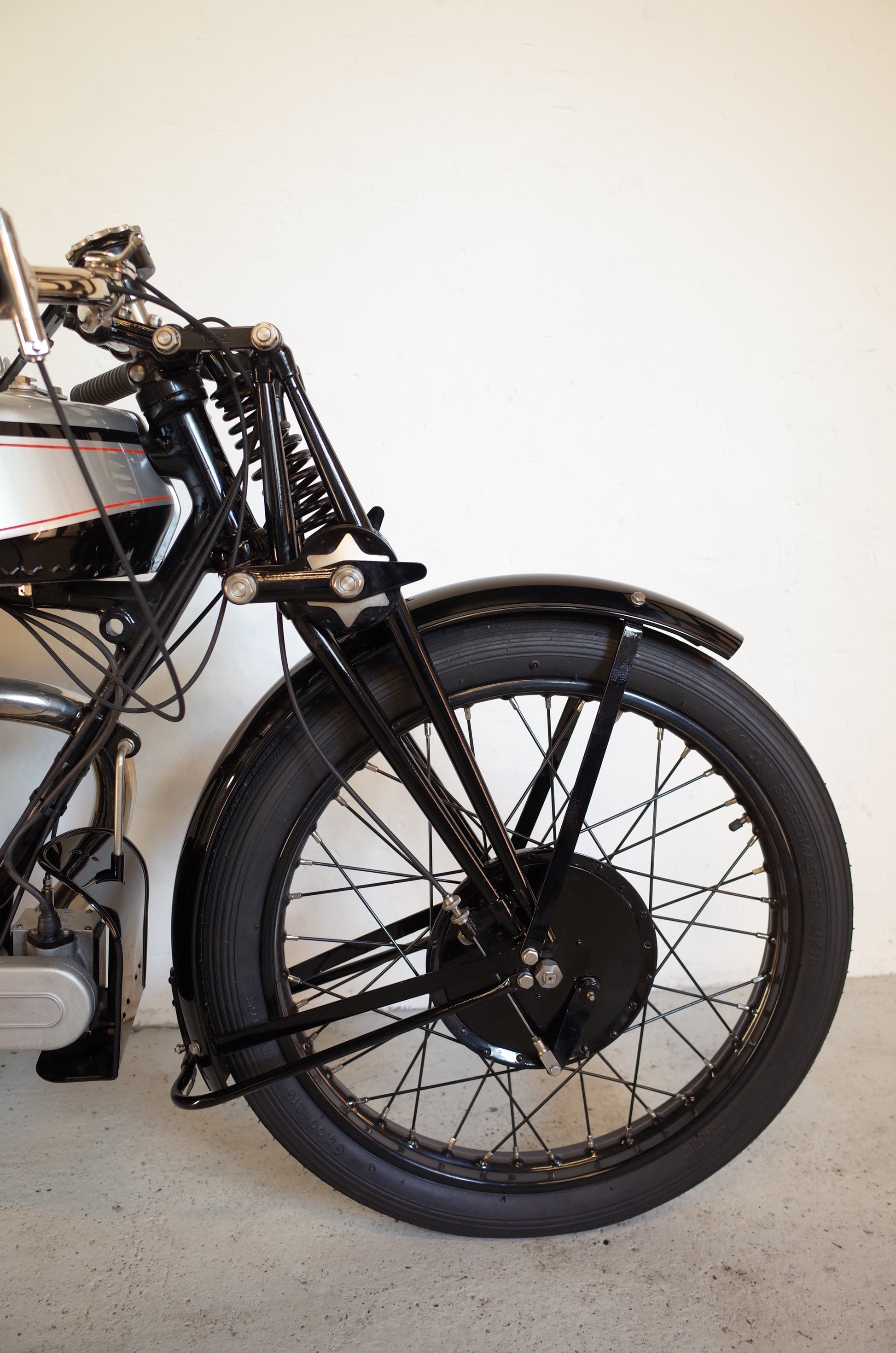 The Model 25 was restored over a period of more than two years by a very experienced and respected restorer in the UK. The entire restoration project is completely documented and involved sourcing correct parts from several countries in Europe and abroad. The TT pannier tanks were fabricated in the UK from a wooden mould, made from 3D scans of an original pair of pannier tanks exhibited in the Brooklands Museum. The Sturmey Archer clutch was renovated in the Czech Republic, the B&B carb renovated by Martin Bratby, Wheels build by Central Wheel, etc. No corners were cut. The original crankcase half with the original engine number stamping is displayed next to the bike, as it was deemed unsafe to use it for running. A blank NOS crankcase half was used instead (with the original kept along the bike).