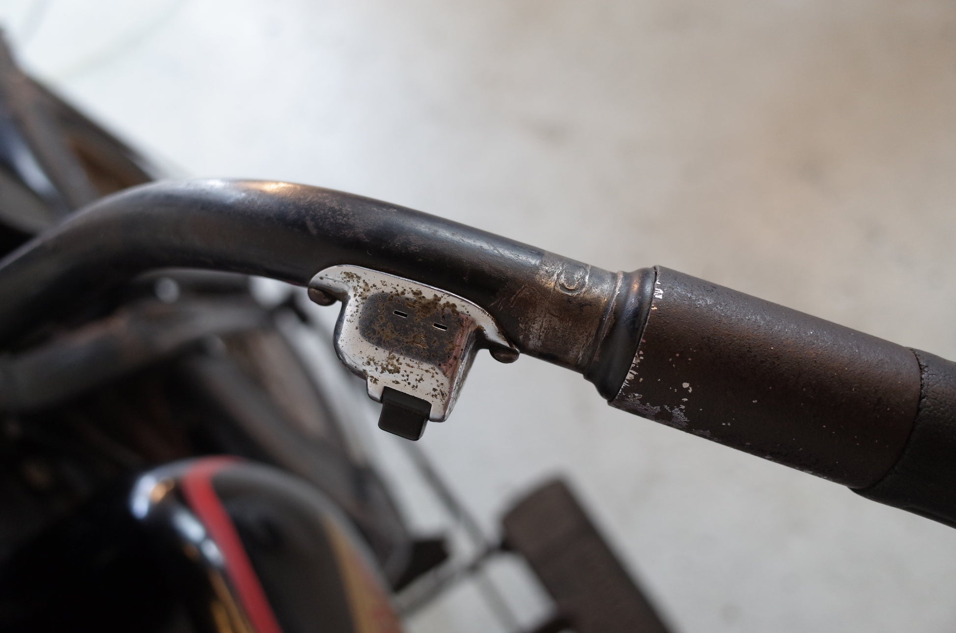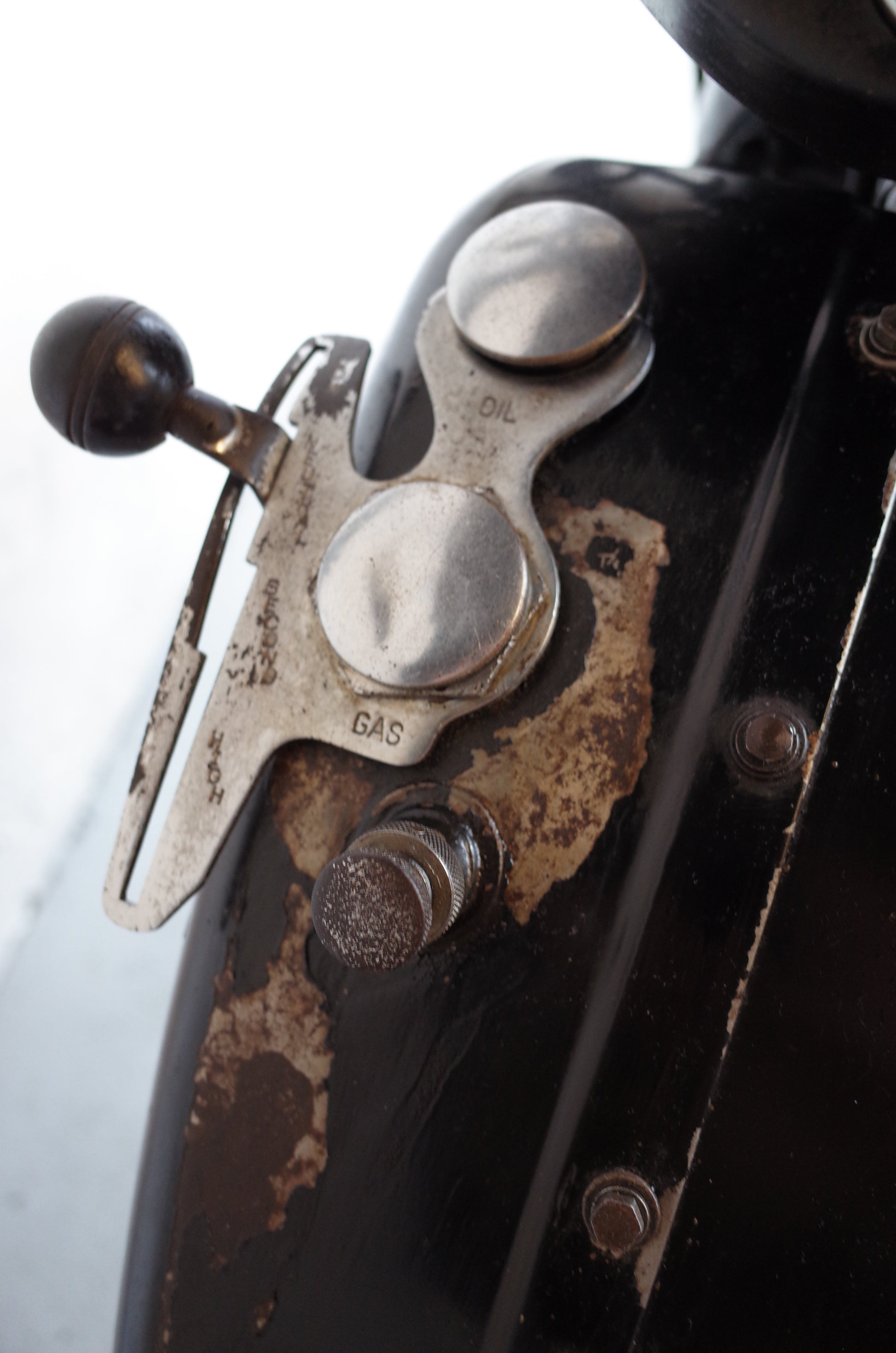 Apart from the headlight and rear light, everything on this bike is original. Absolutely no repro parts fitted. The paint is original and must have been applied just before or after the war. The art deco style decal of the petrol tank is from 1934, so the best guess is that the owner at the time, wanted to change from the standard olive green to something more civilian. Most likely it was done professionally at a dealership. Small HD decals are also applied to the toolbox, battery box and front and rear mudguard.