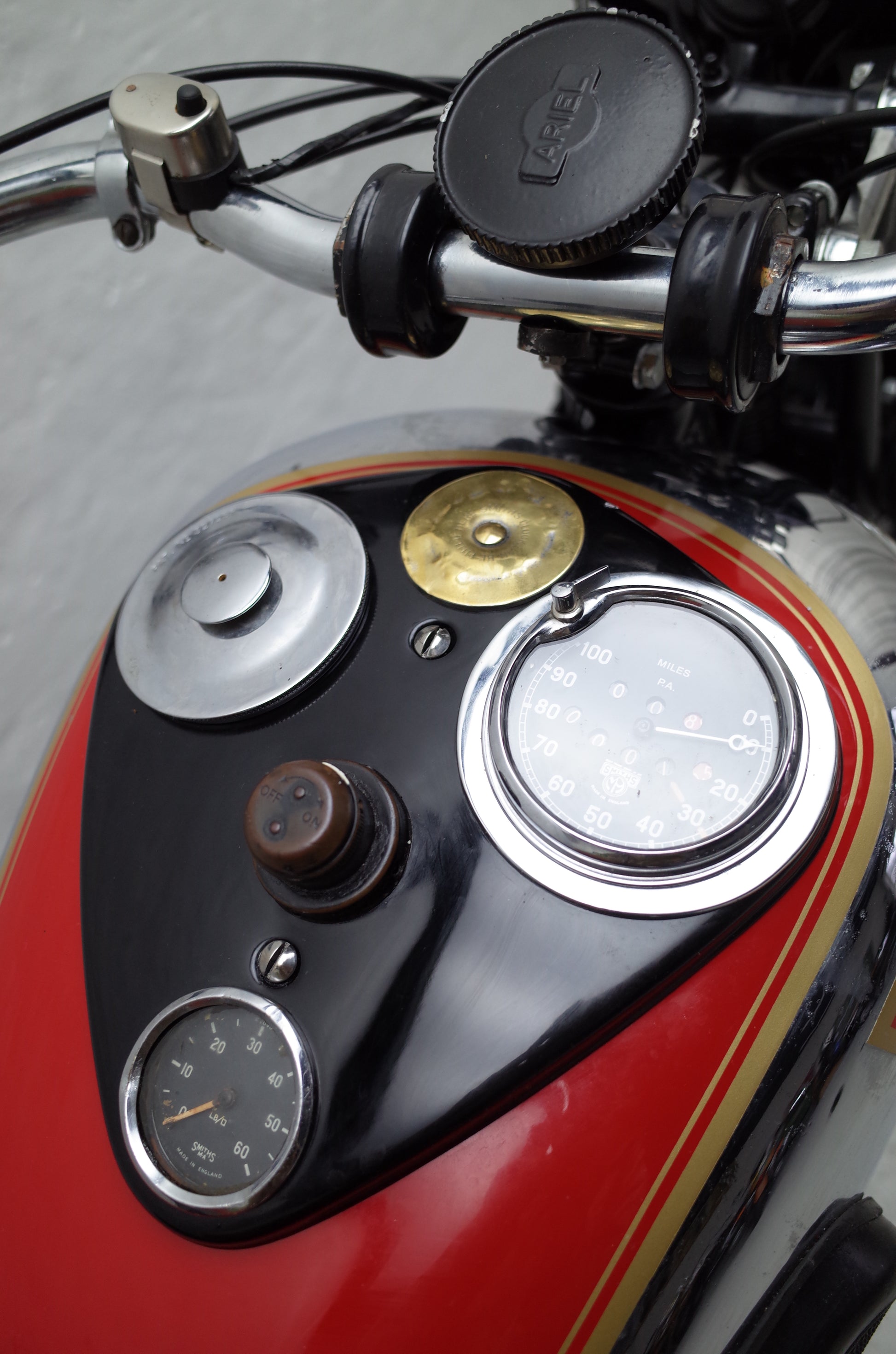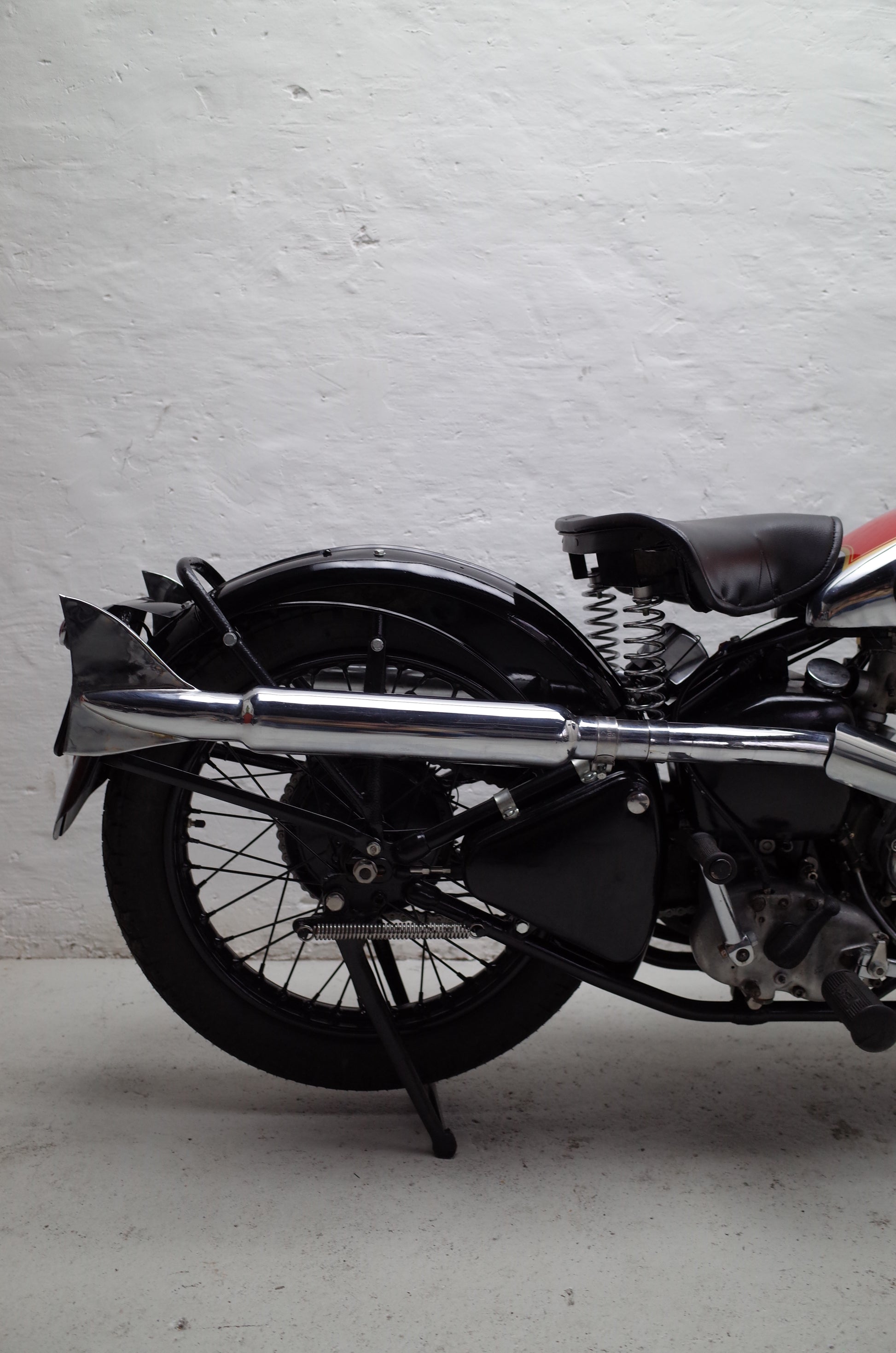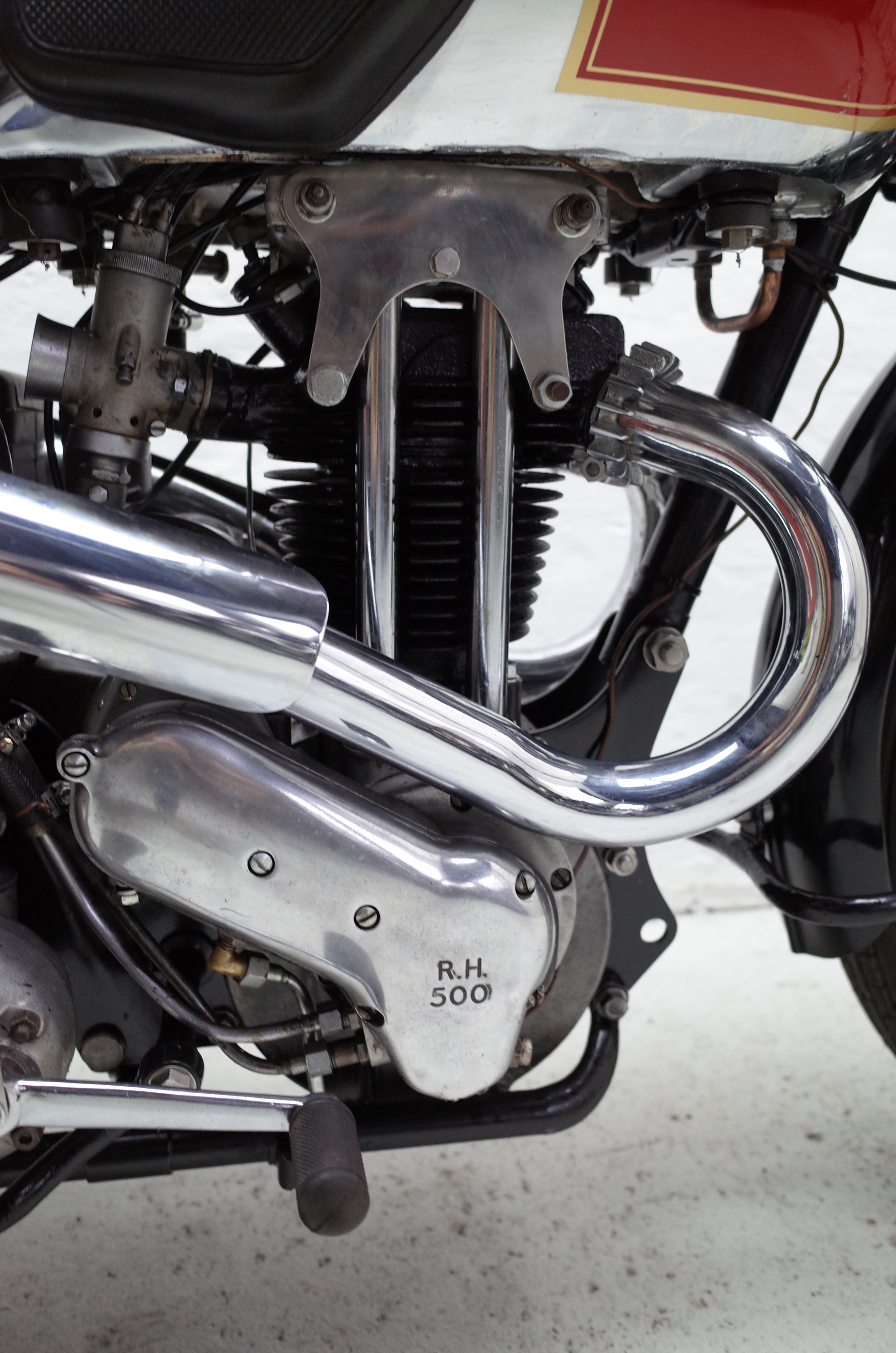 The Red Hunter is fitted with upswept exhaust pipes and remains in original condition. Some smaller parts are chromed that should be painted black, like saddle springs, rear stand spring etc. but otherwise very original specification throughout. Original early Smiths speedo mounted in the petrol tank panel together with the original Smiths oil gauge and Lucas tank panel inspection light.
