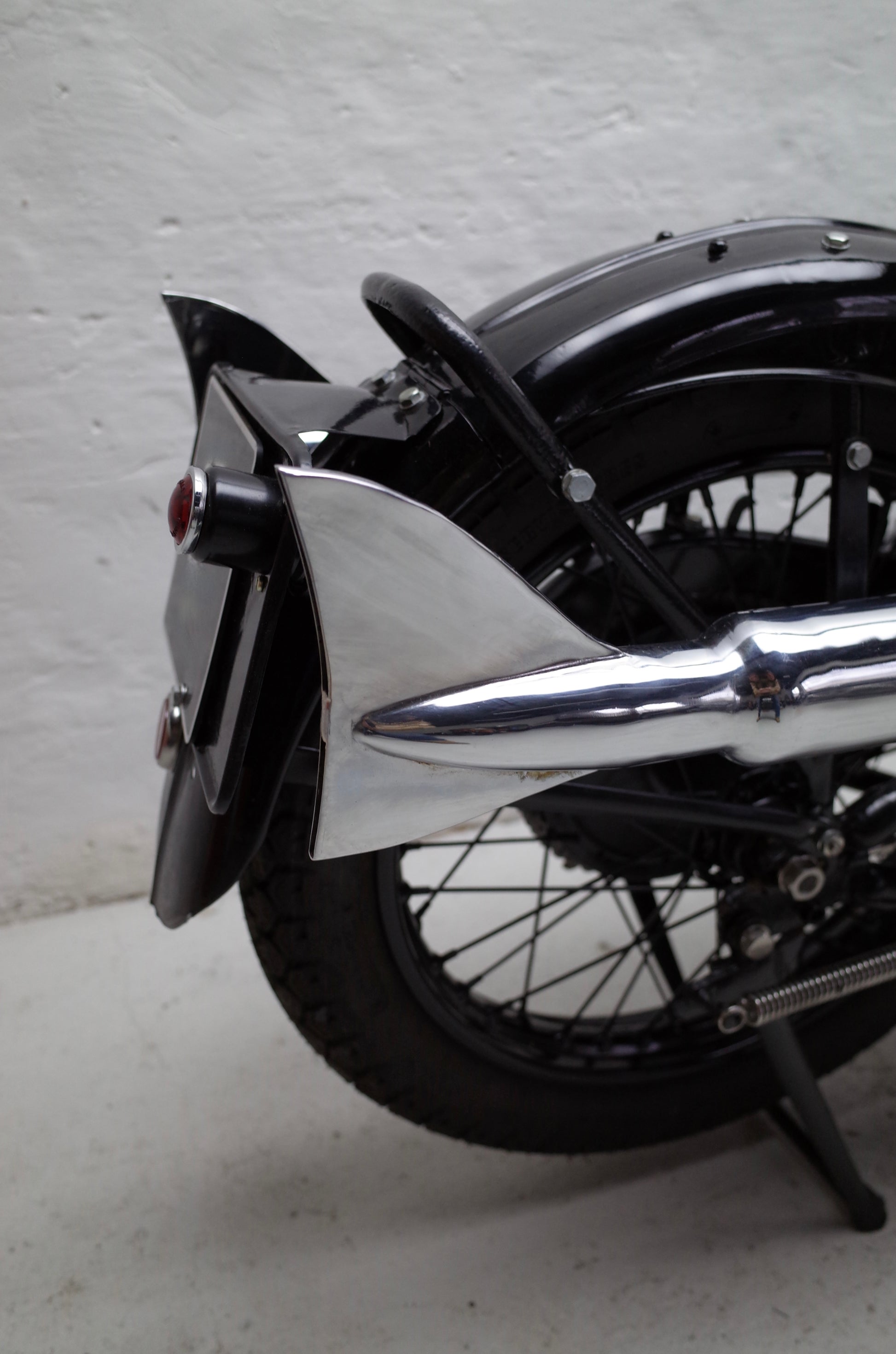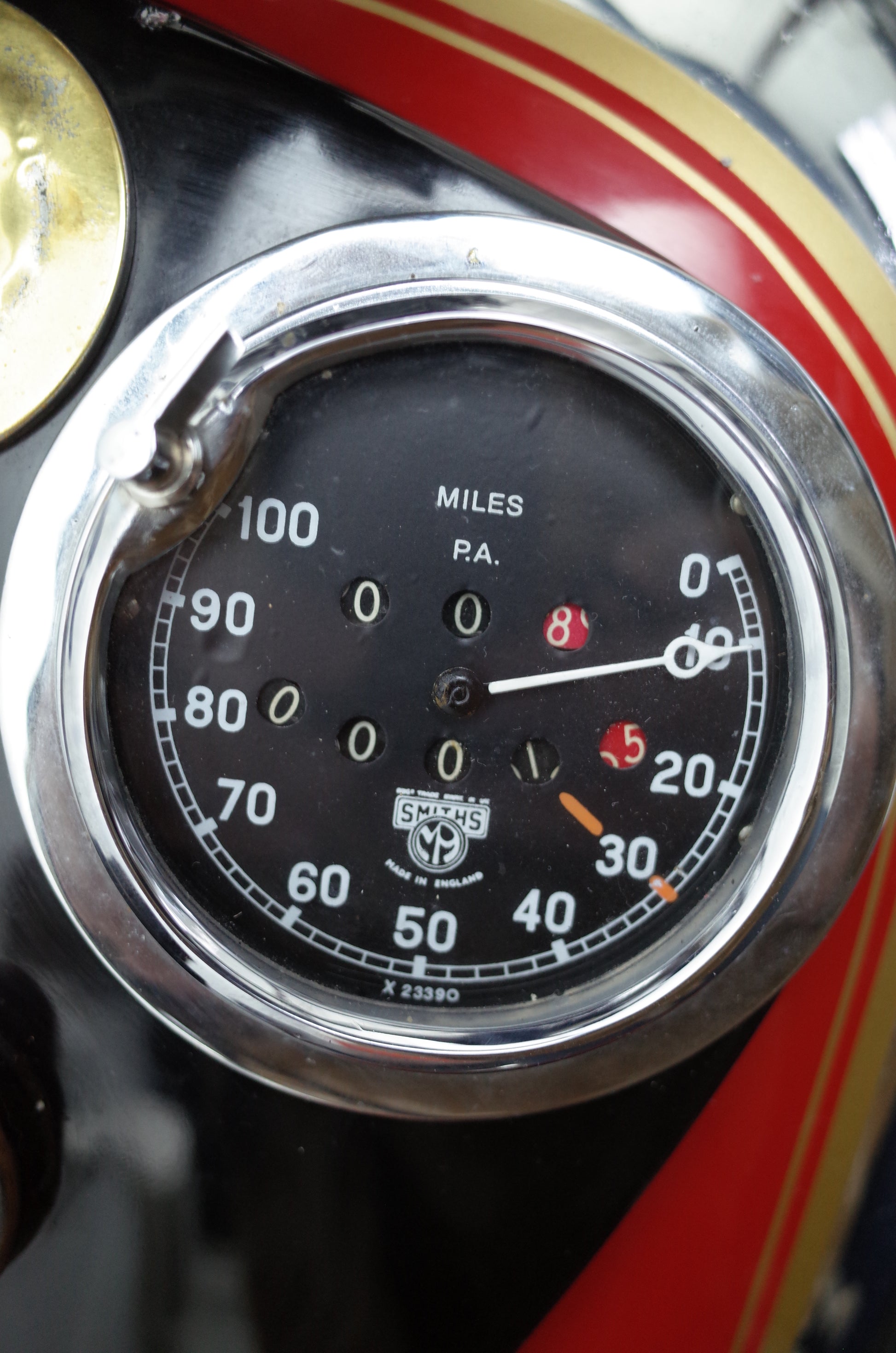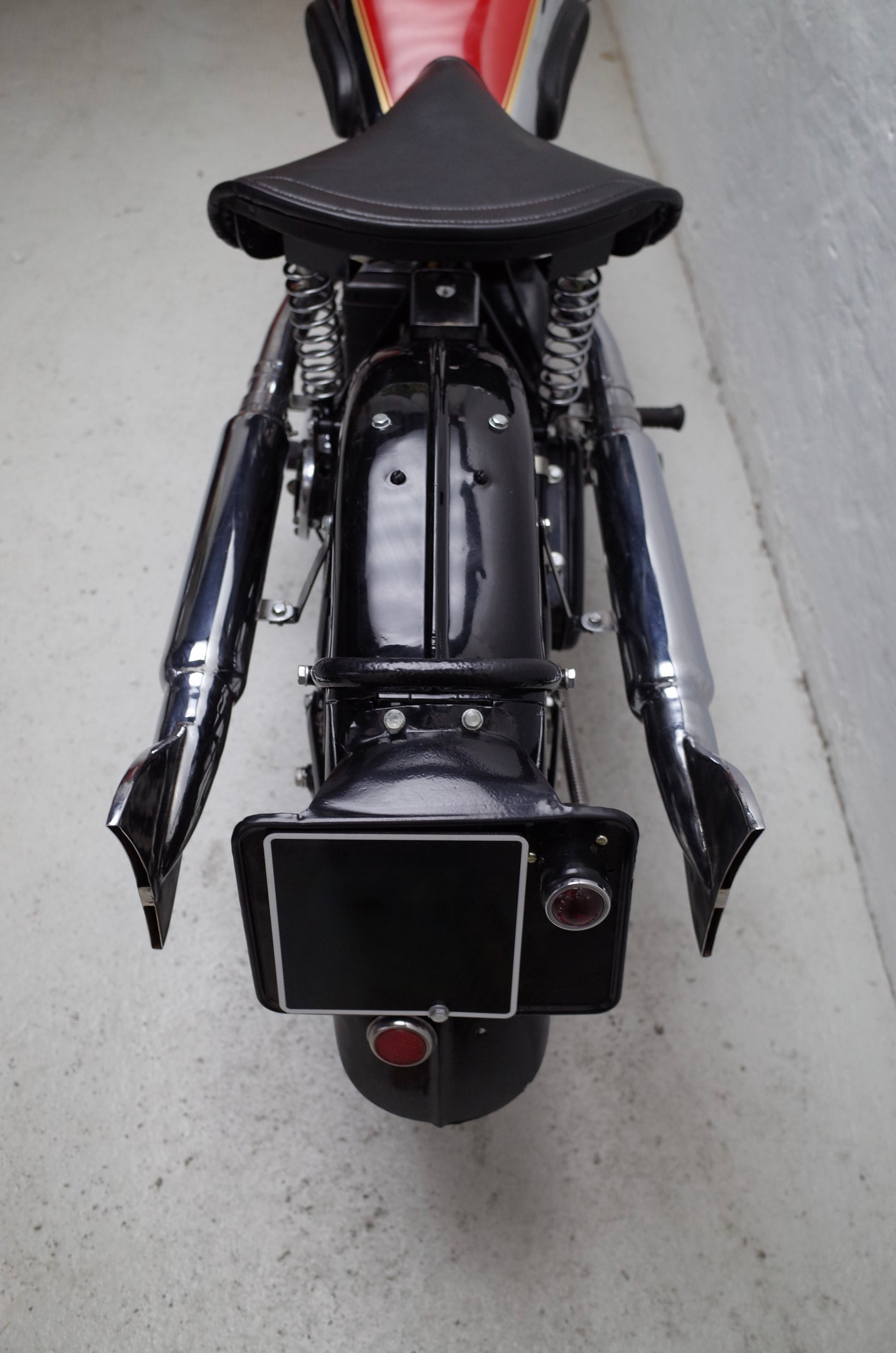 The Red Hunter is fitted with upswept exhaust pipes and remains in original condition. Some smaller parts are chromed that should be painted black, like saddle springs, rear stand spring etc. but otherwise very original specification throughout. Original early Smiths speedo mounted in the petrol tank panel together with the original Smiths oil gauge and Lucas tank panel inspection light.