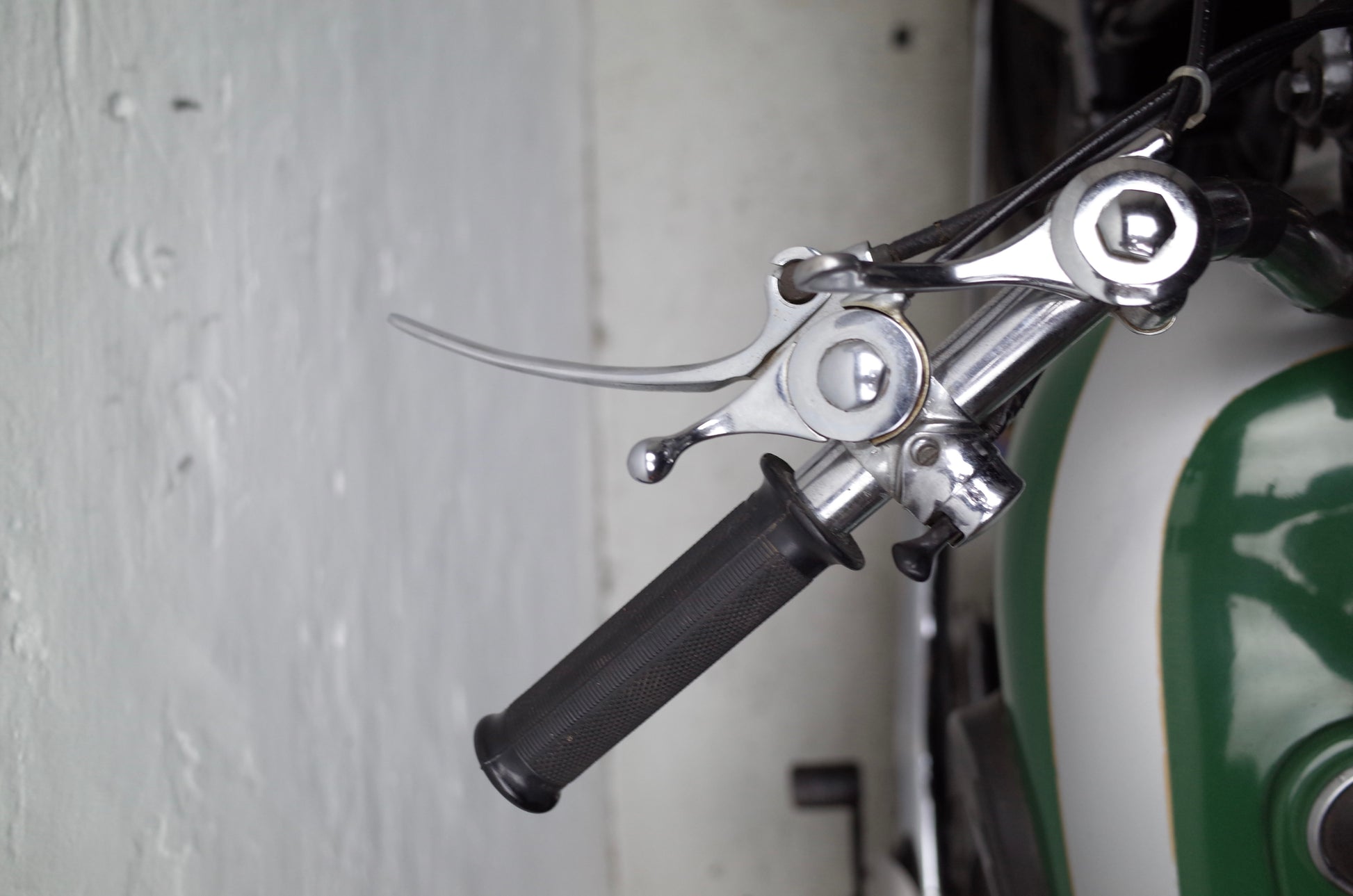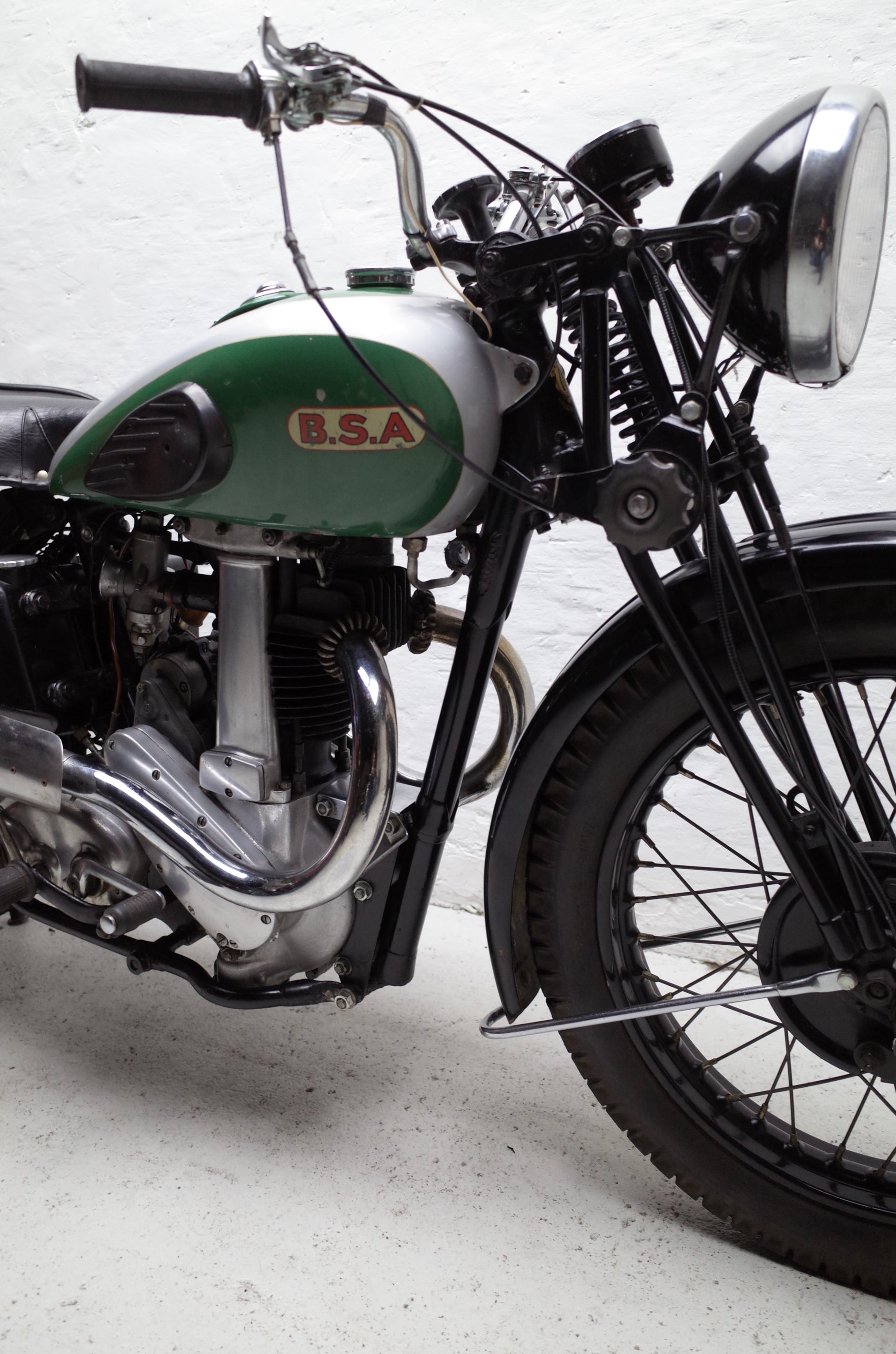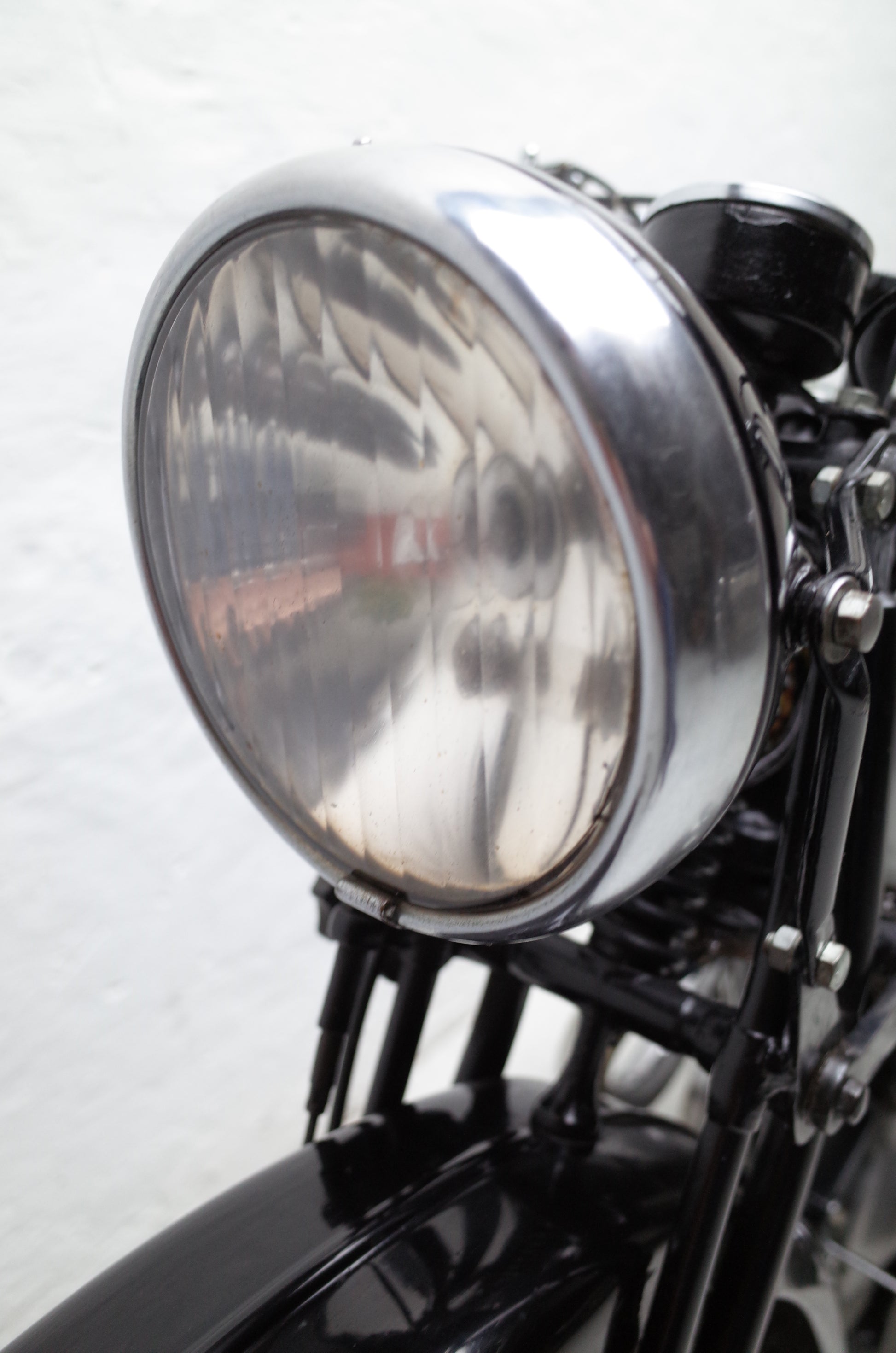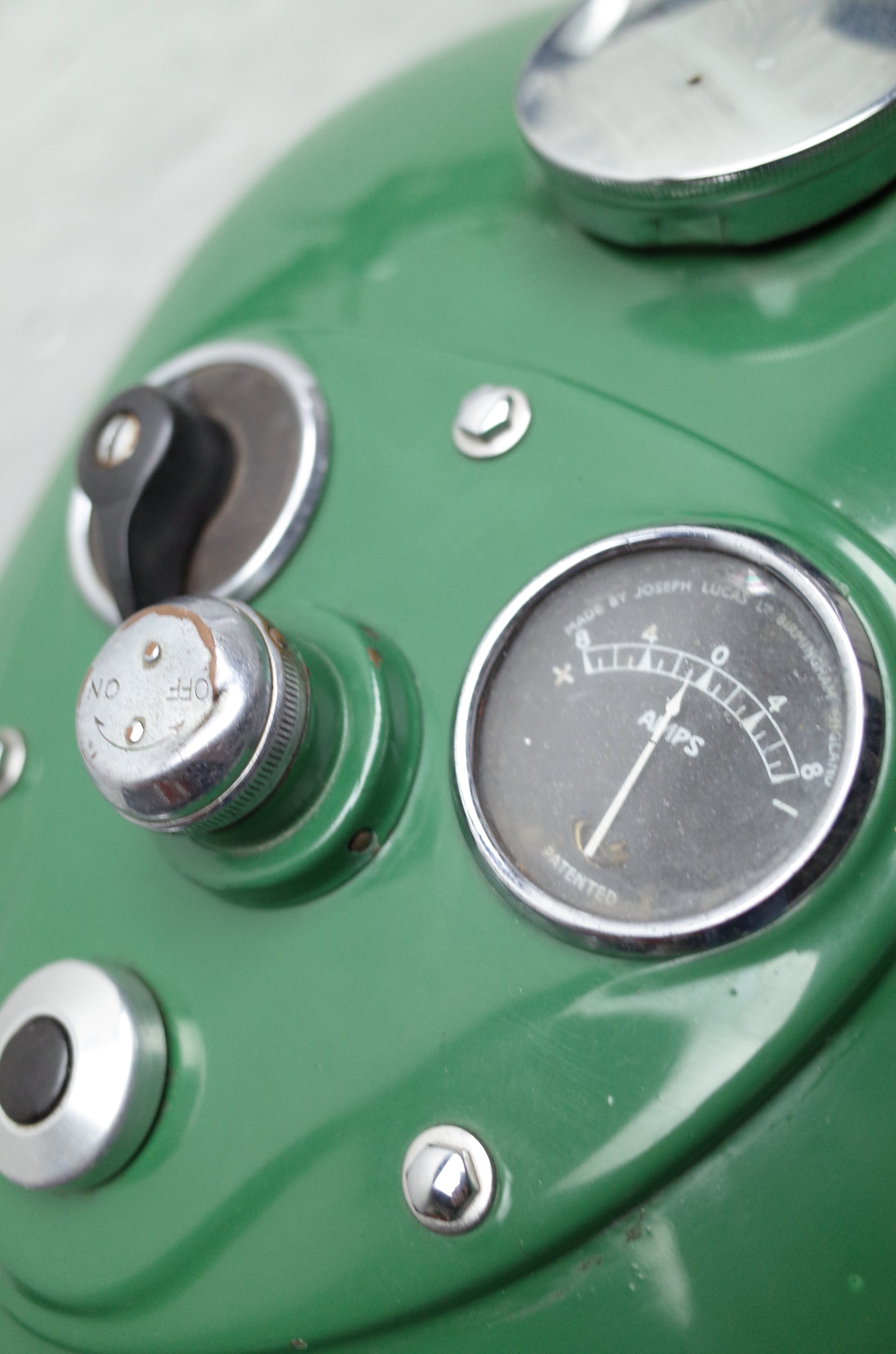 The original and characteristic 1930s BSA levers are still on the bike (hard to find if missing), as is the original Smiths speedo in Kilometres, Lucas Amp meter, light switch and panel light.