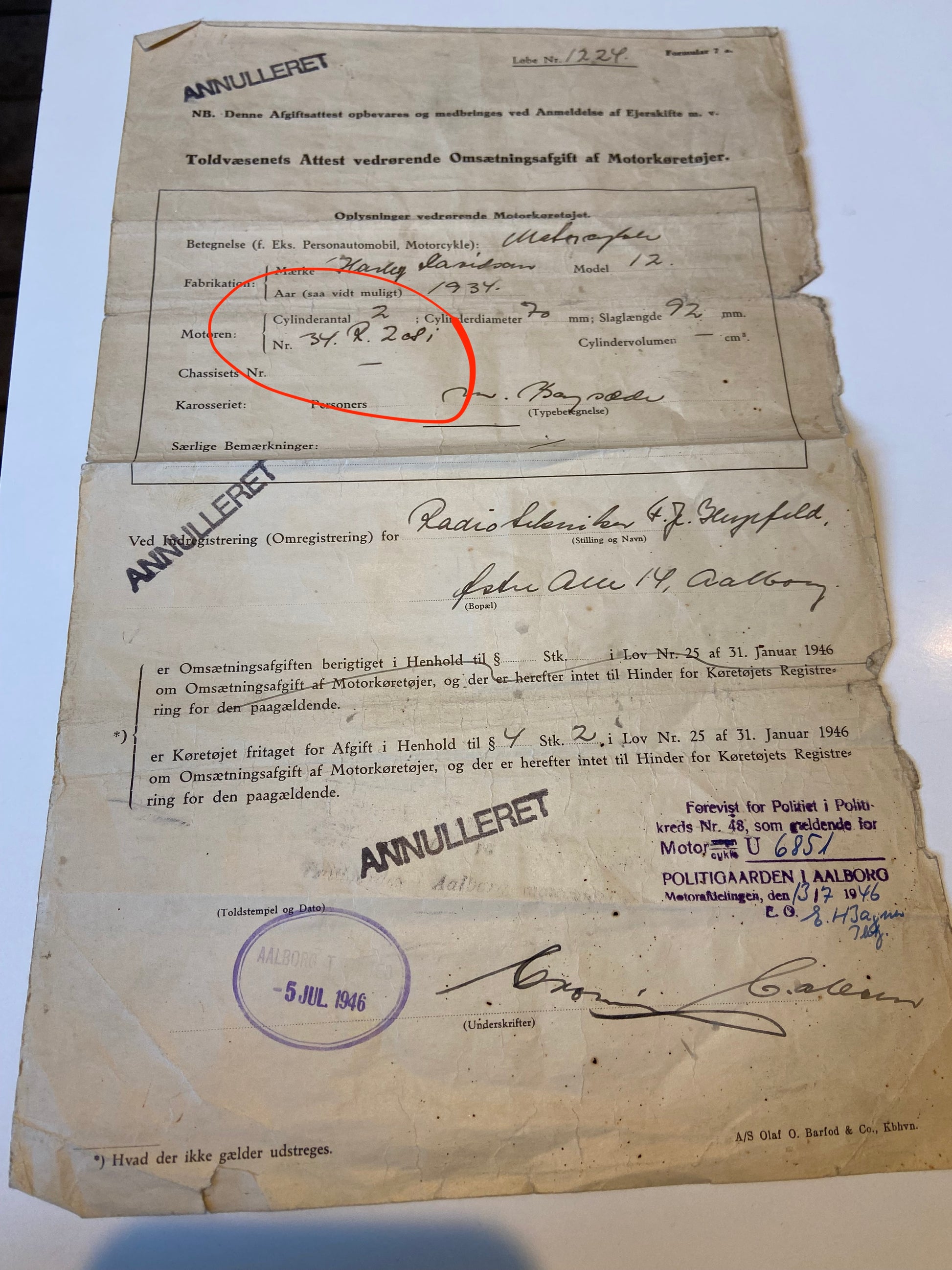 On the modern EU registration document, the HD is registered as a 750cc 1934 HD Model R. This registration has followed the bike since 1946 and is most likely due to a replacement crankcase. The original registration document dates this change back back to 1946 so I believe this was done by an official HD dealership, to replace a faulty or damaged crankcase. All parts of the HD and the crankcase and entire engine is clearly WLC.