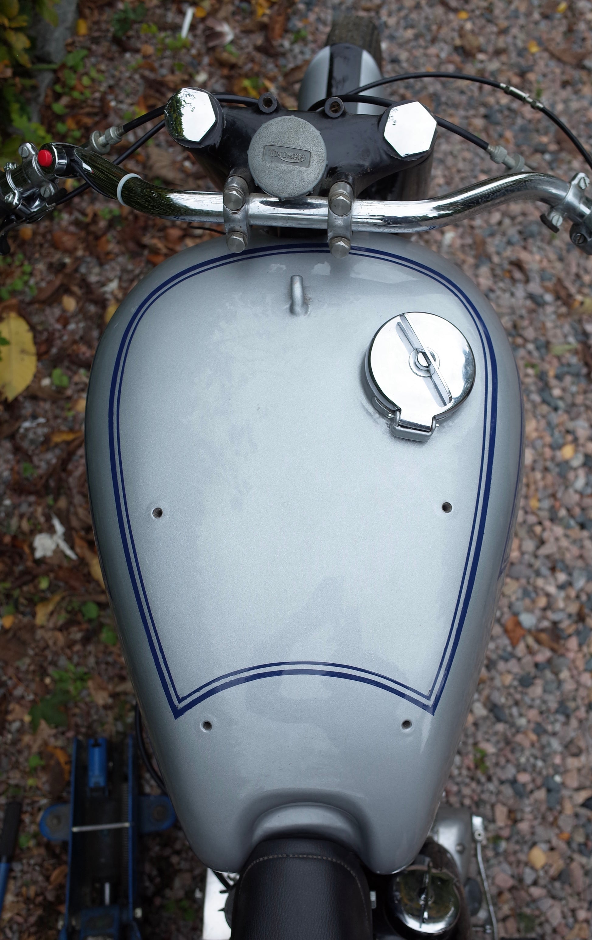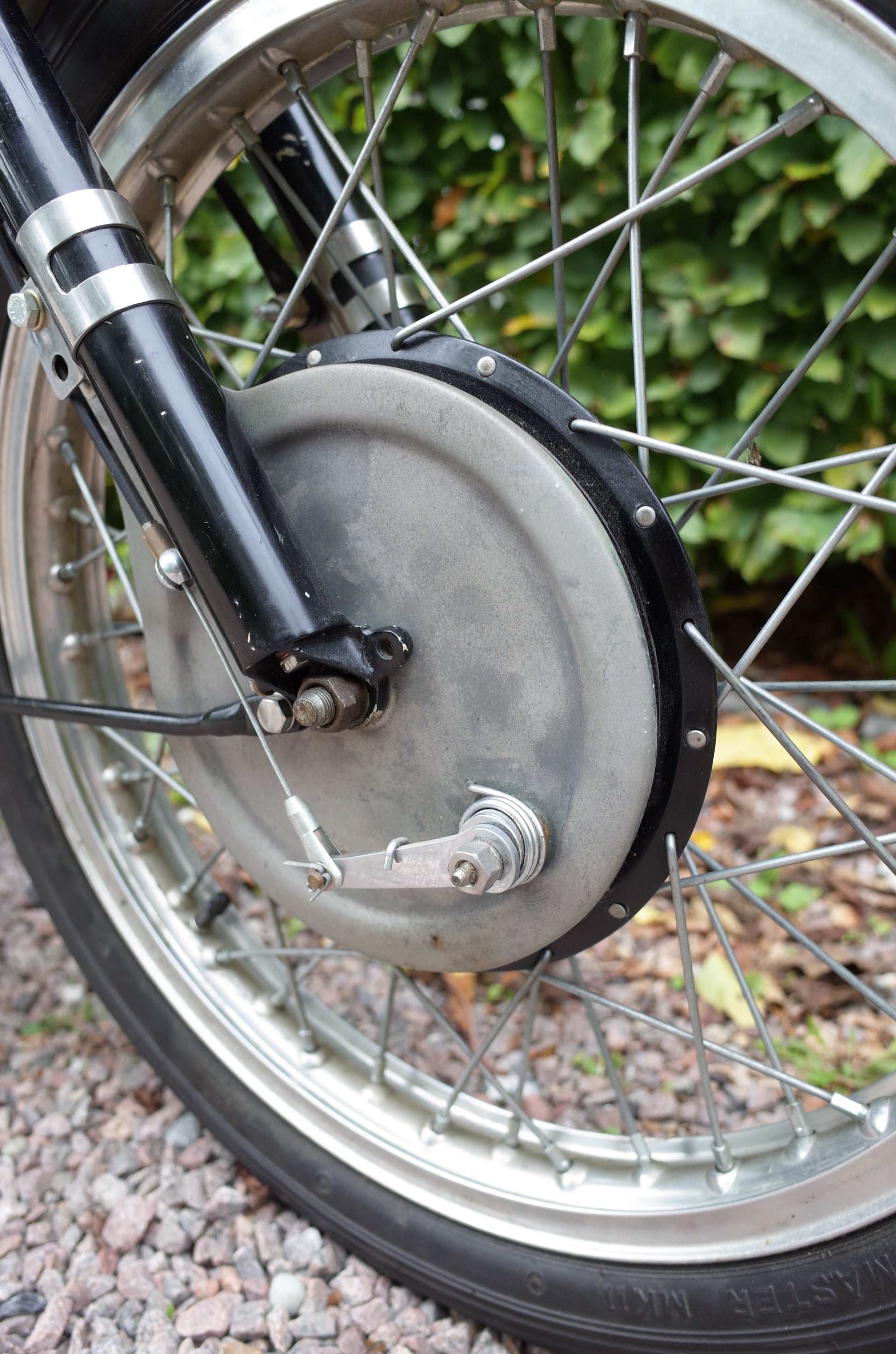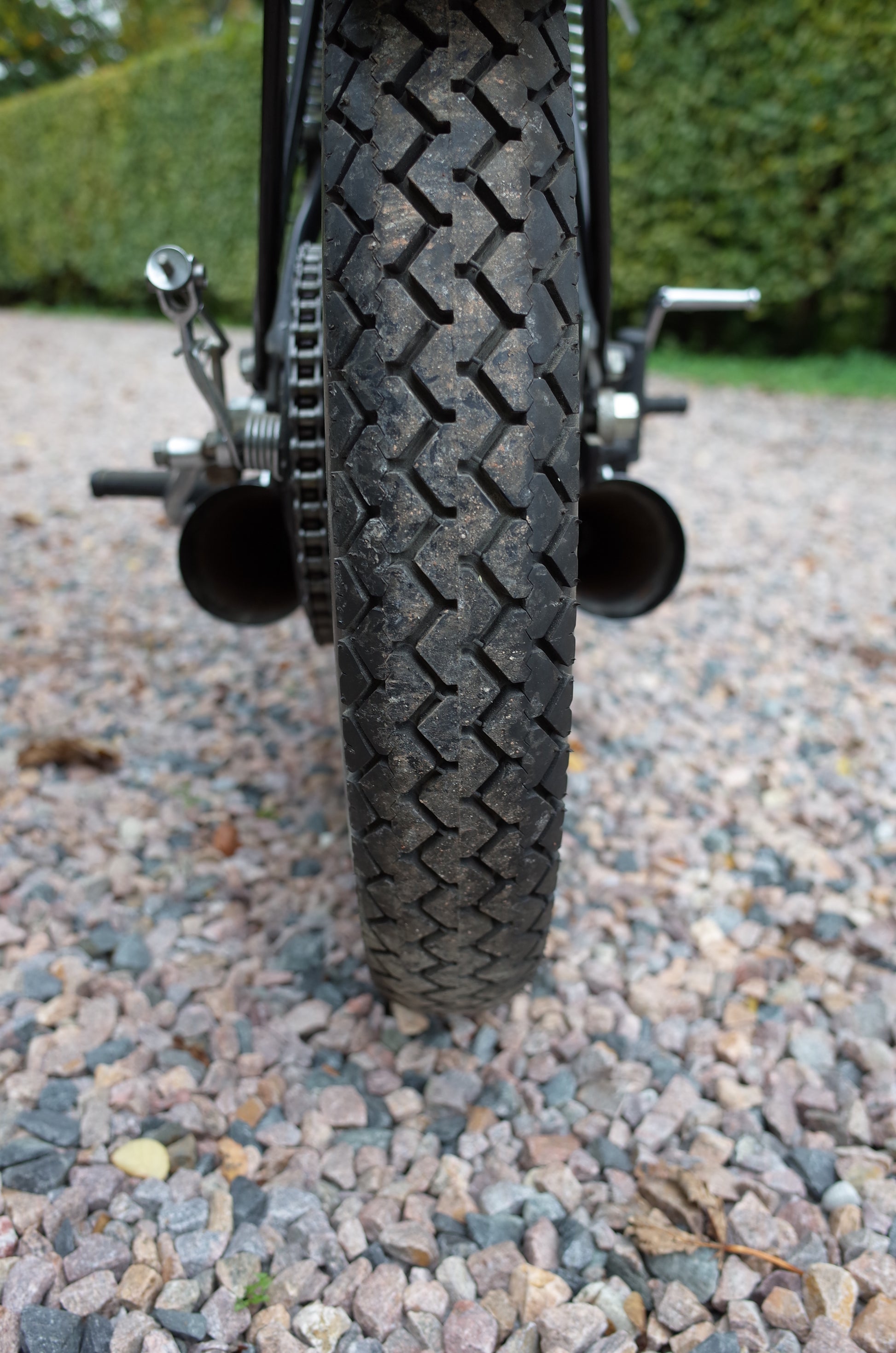 The original front brake plate in magnesium is fitted and in very good condition with no signs of corrosion. The original Grand Prix petrol and oil tank, the original footrests and brake pedal are fitted.