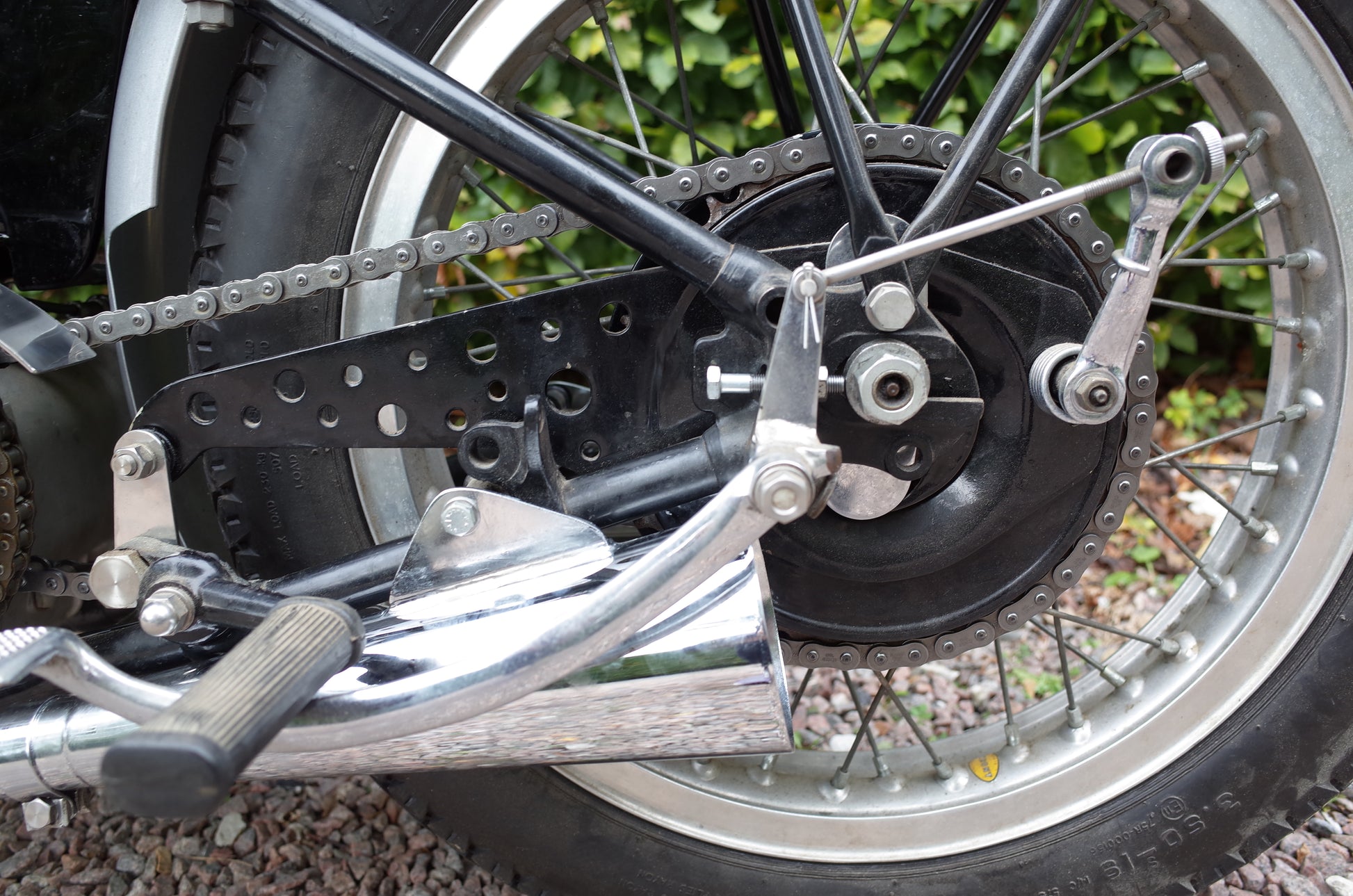 Triumph telescopic forks, and Triumph’s unique sprung-hub rear suspension completes the specification and despite the quirks of its sprung hub rear suspension, the Grand Prix’s racing pedigree still earned it a significant place in British motorcycle racing history.