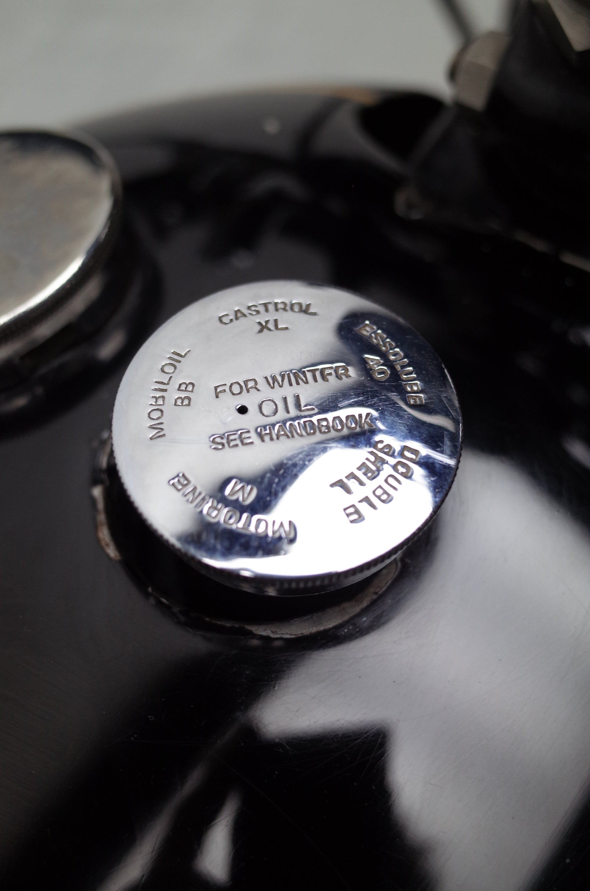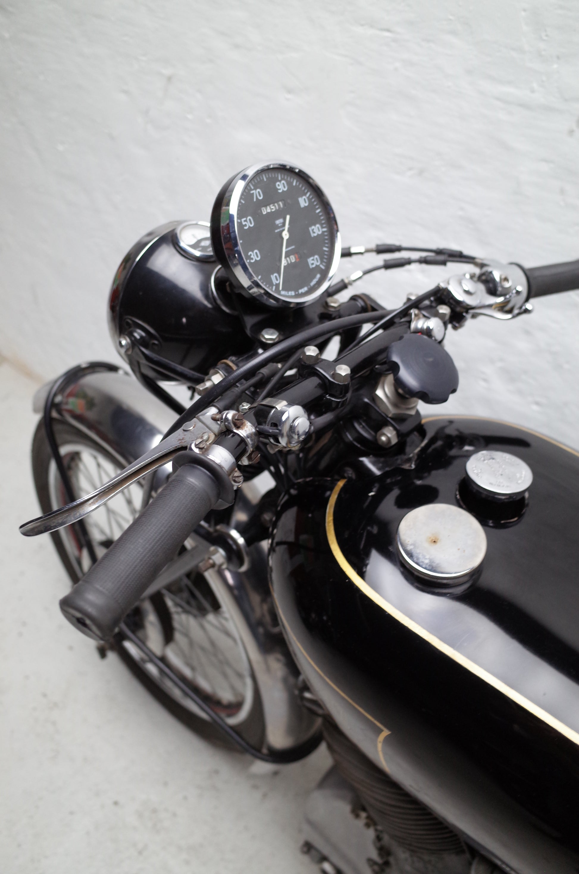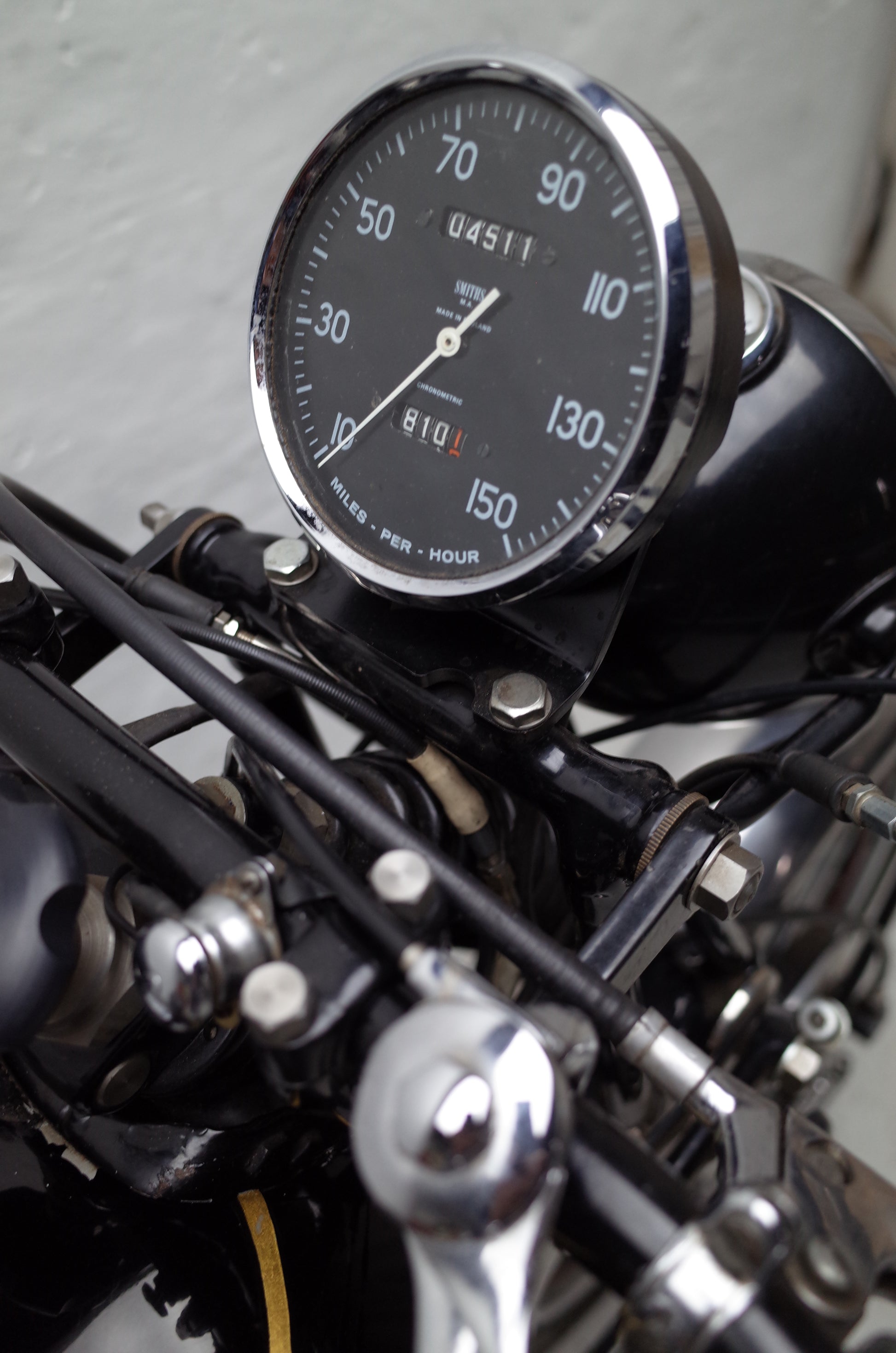 There is a lovely 5inch Smiths Black Shadow Speedo fitted and ribbed Black Shadow brake drums at the front. Subtle upgrades include a modern self generating BTH magneto for ease of starting and the original Miller dynamo being converted to 12V. The original Miller rear light is present as is the original 19inch Dunlop rear rim. The original toolbox is also present however not fitted on the photos.