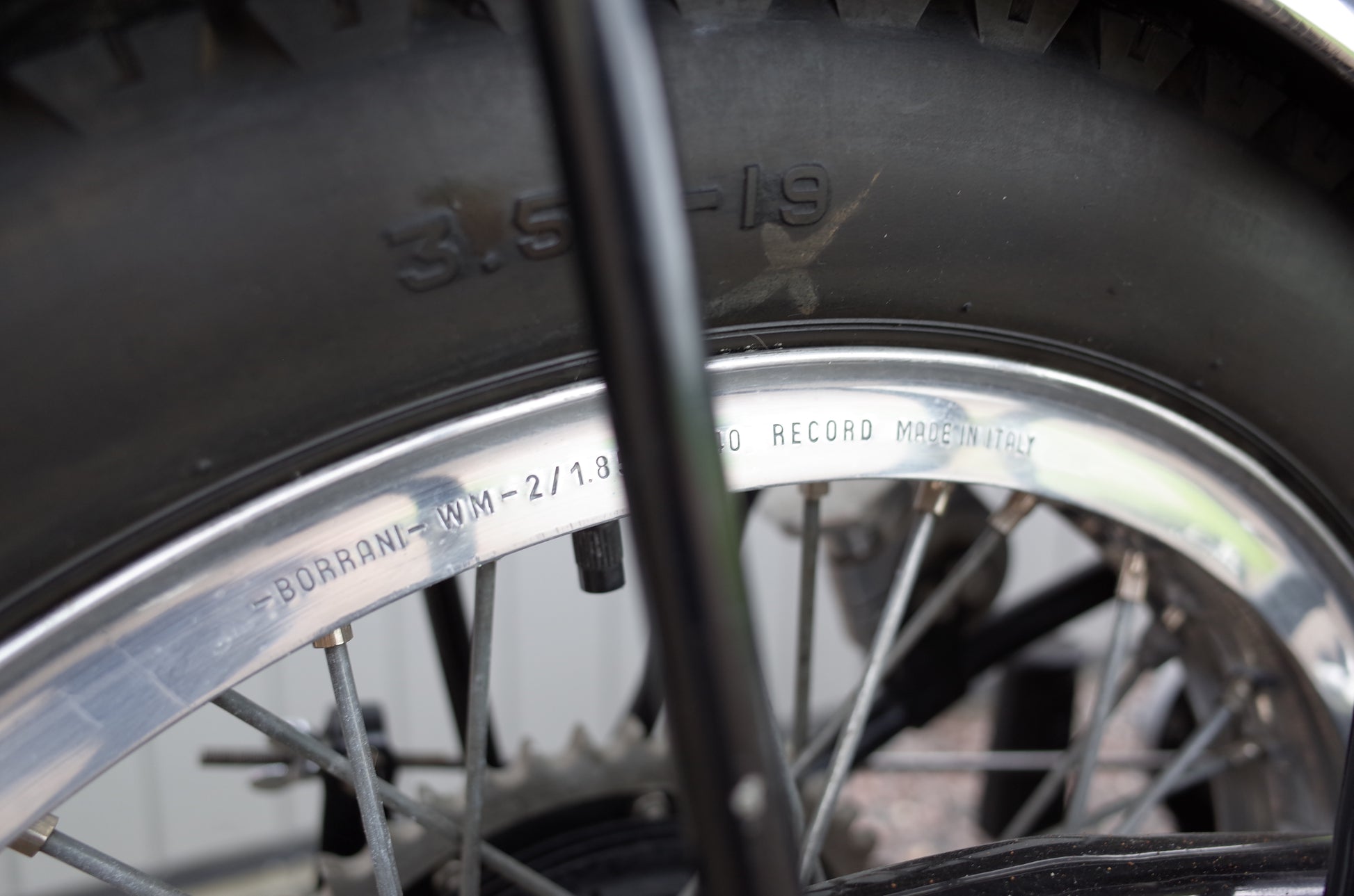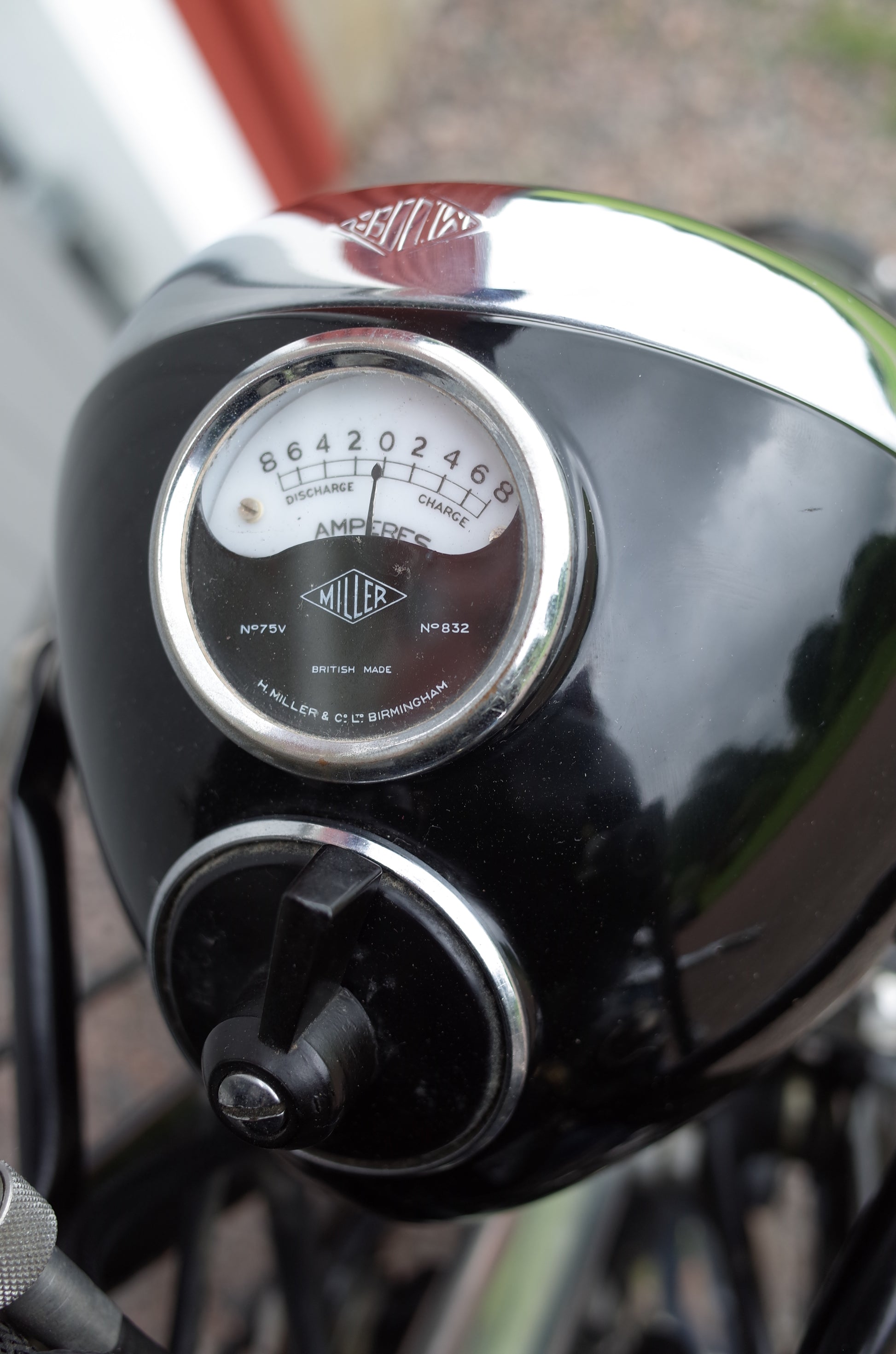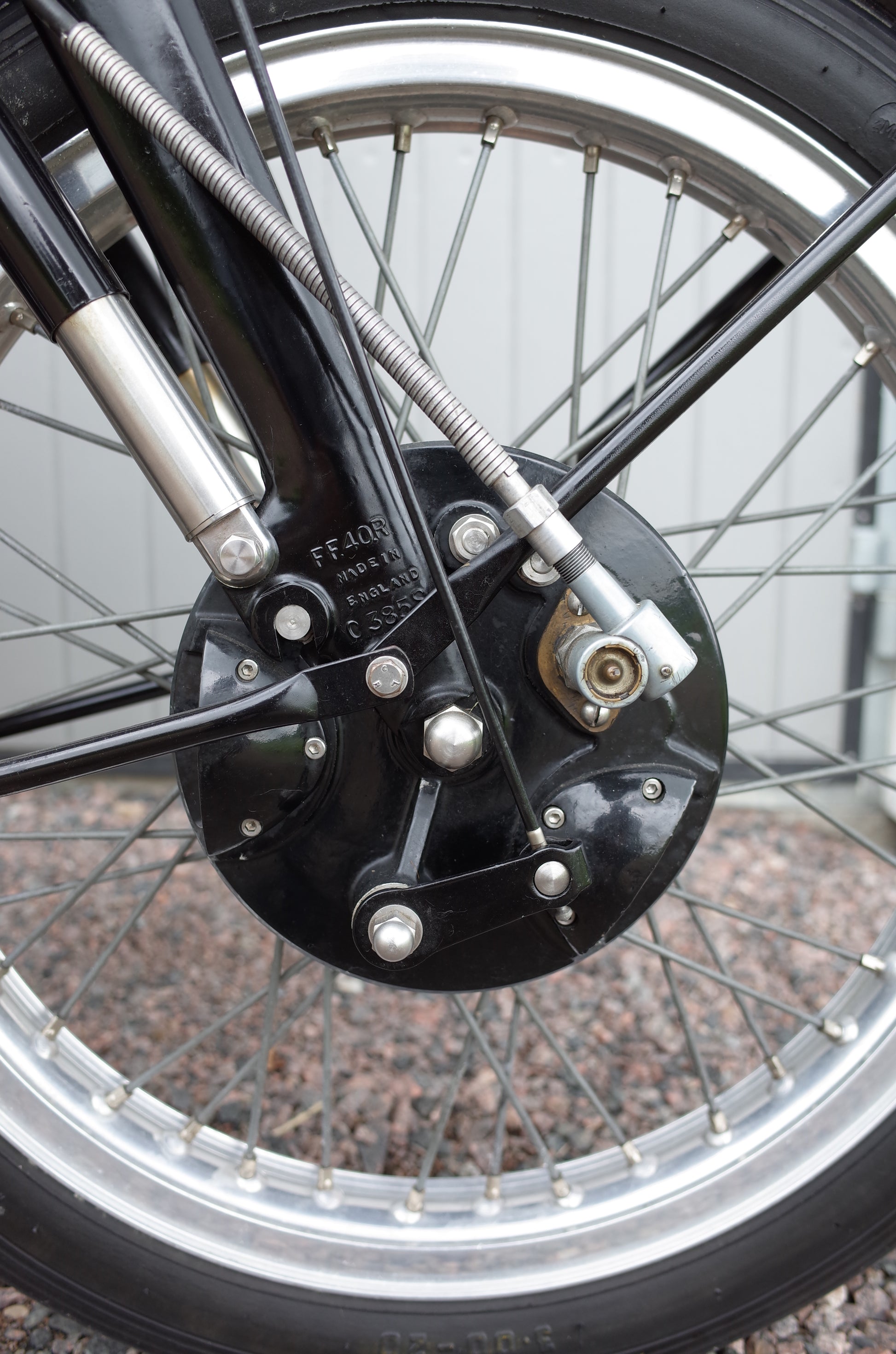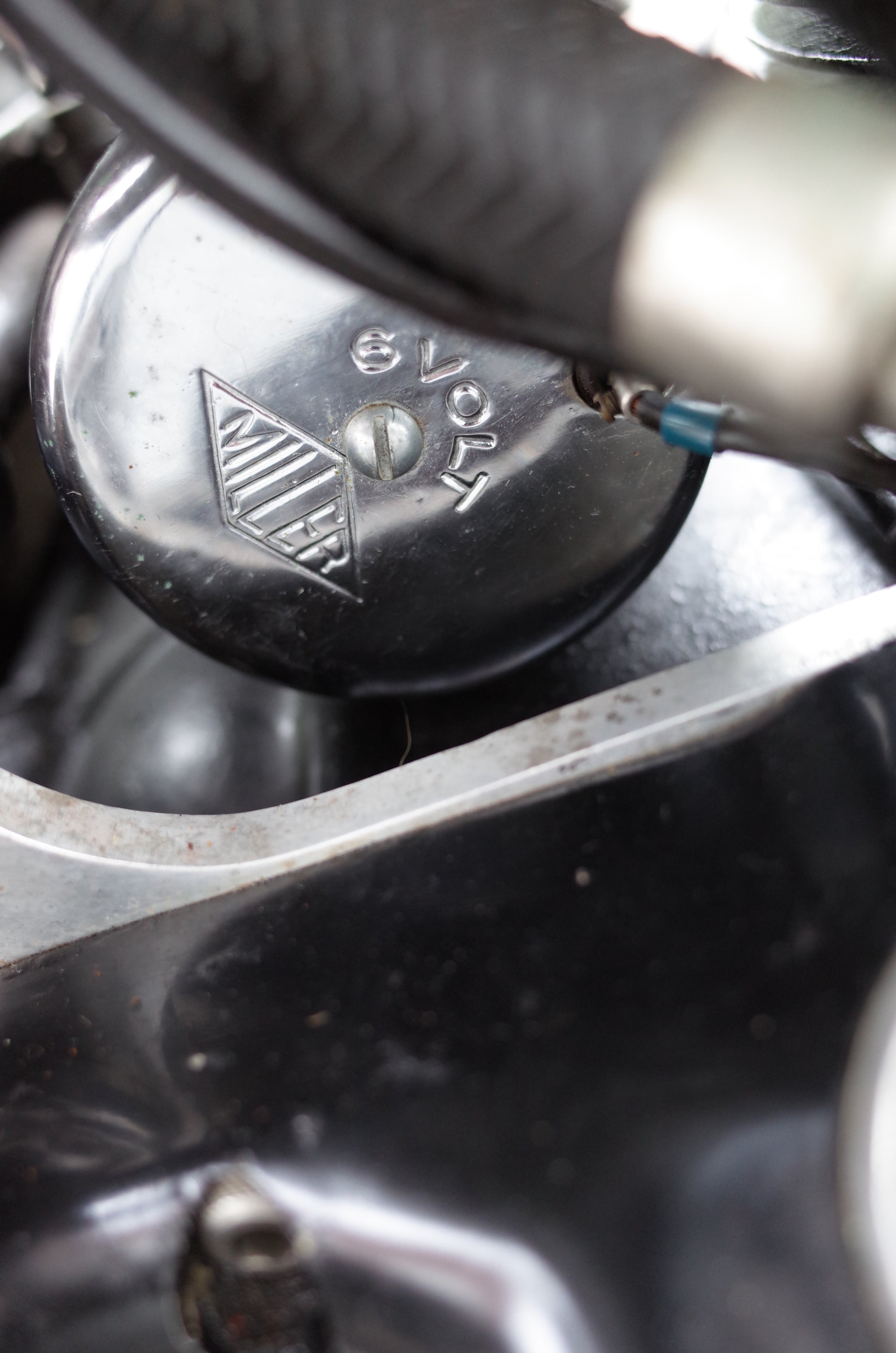 Black Lightning vented brake plates and Black Shadow brake hubs are laced to mint condition Borrani Record alloy rims. Correct Miller headlight and rearlight together with the correct MIller 6V dynamo.