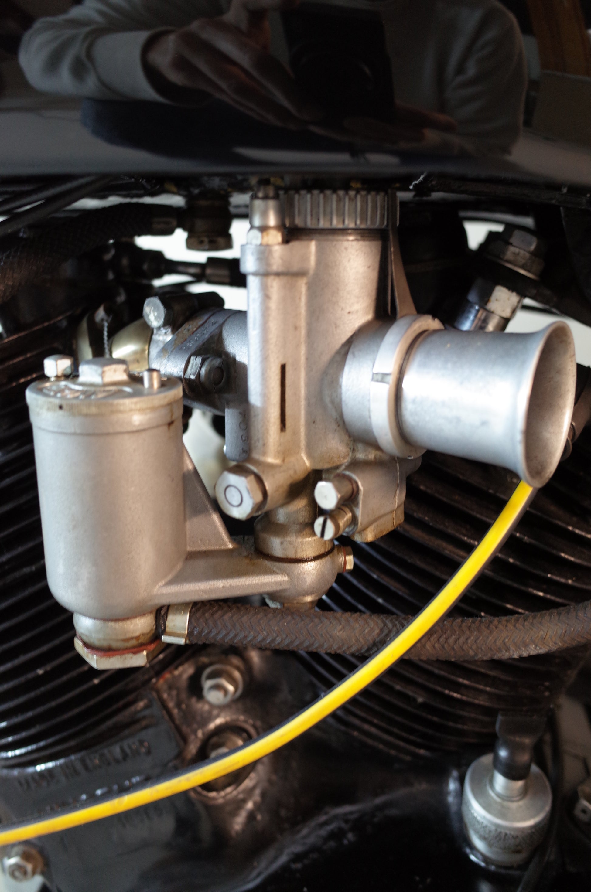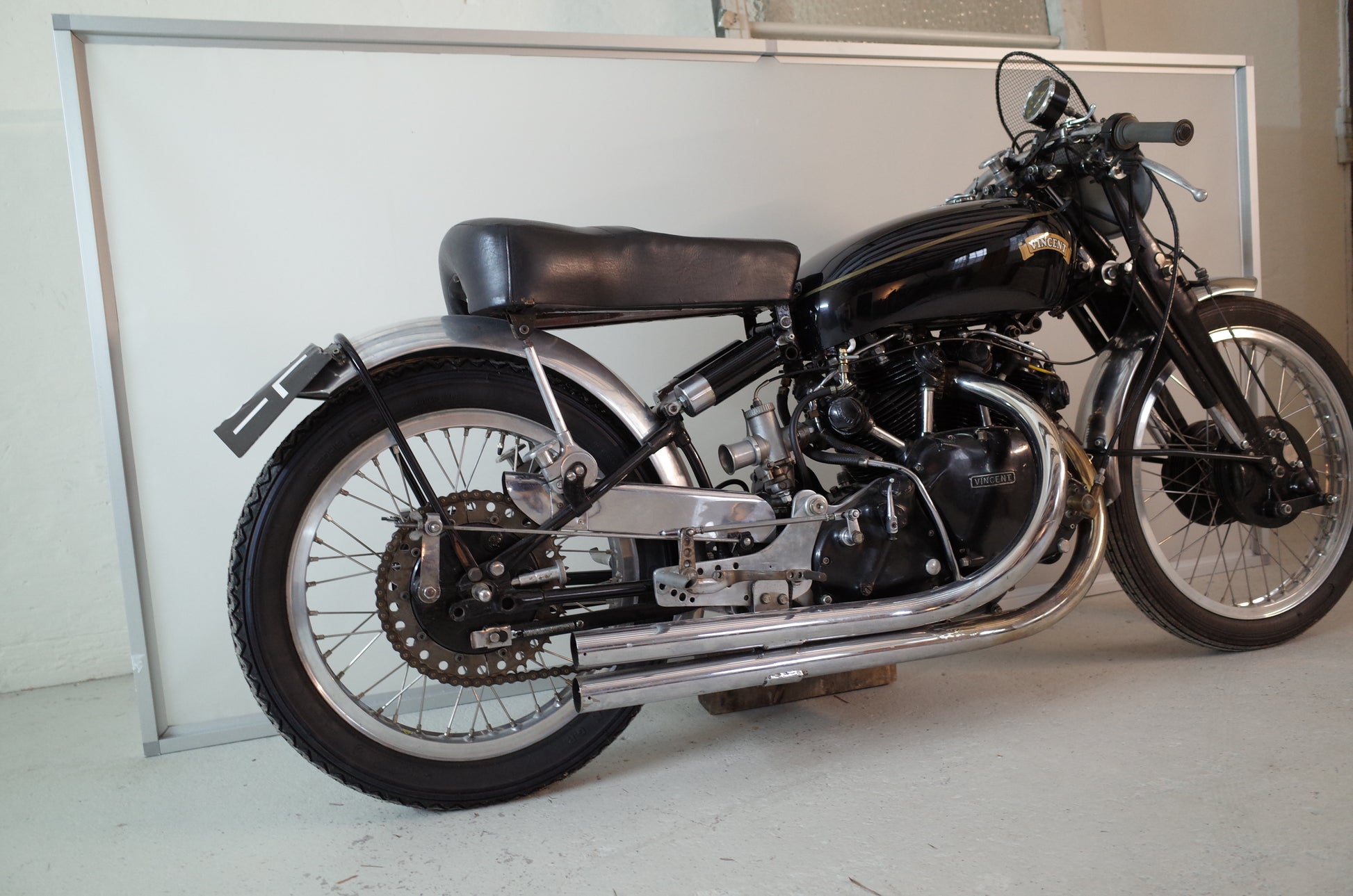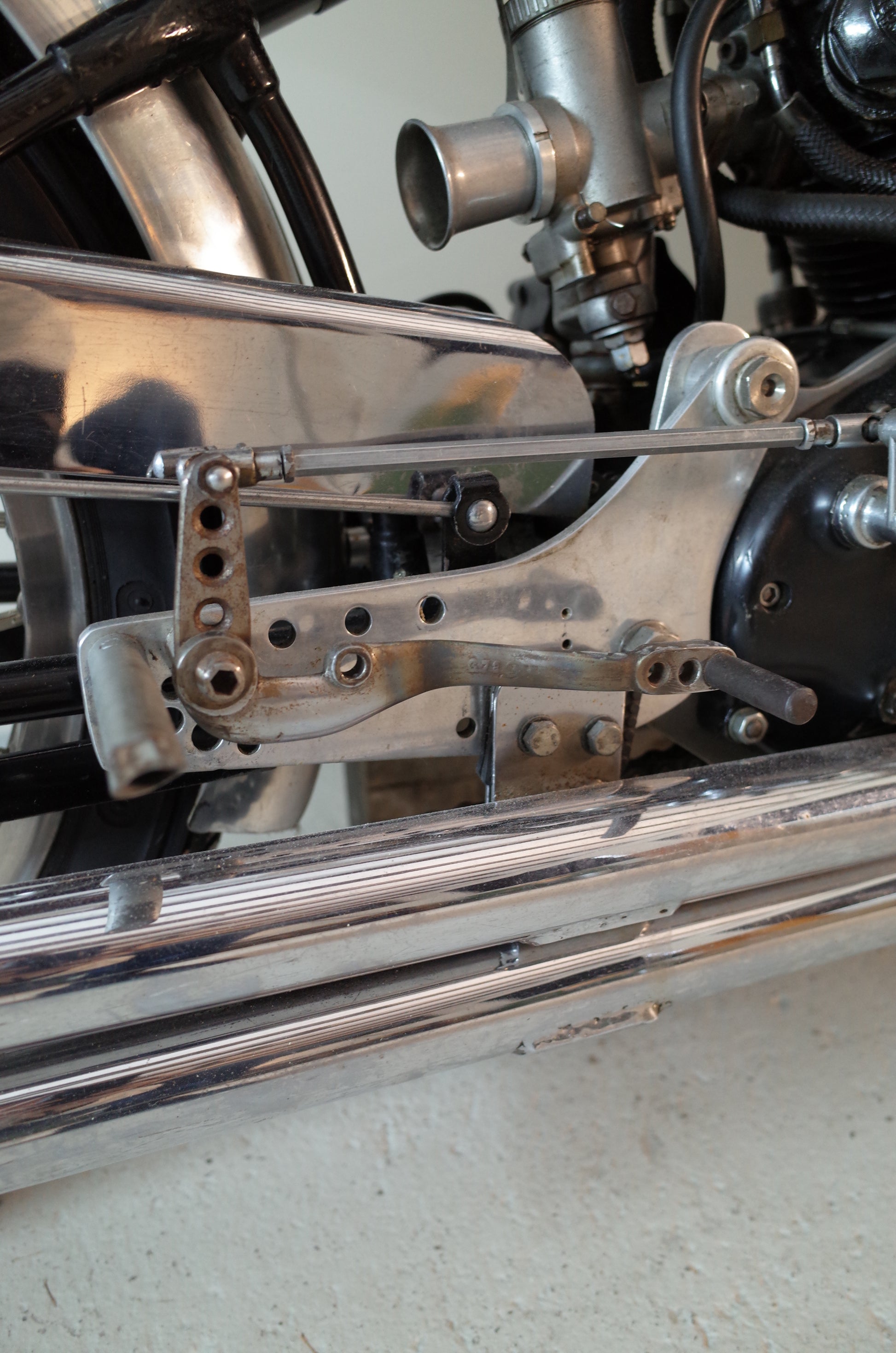 In the 2010s the Vincent was restored and rebuild to Black Lightning specification with rare Smiths yellow dial rev counter specific to the Black Lightning, Lucas KVTT Racing Magneto, a racing magneto build exclusively for the Black Lightning model, Amal GP carburettors, massive 2inch exhaust pipes and other goodies. Lightened alloy footrest hanger plates, footrests and gear linkage mechanism and alloy mudguards, are again to Black Lightning specification
