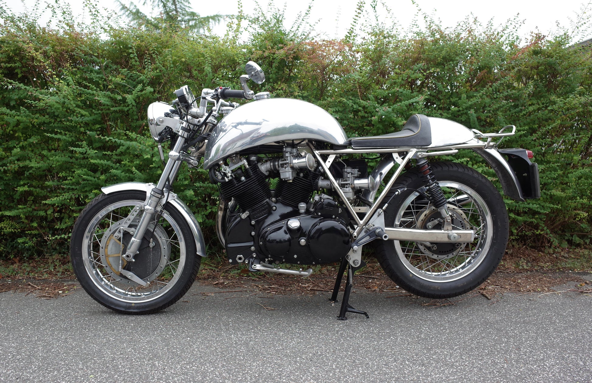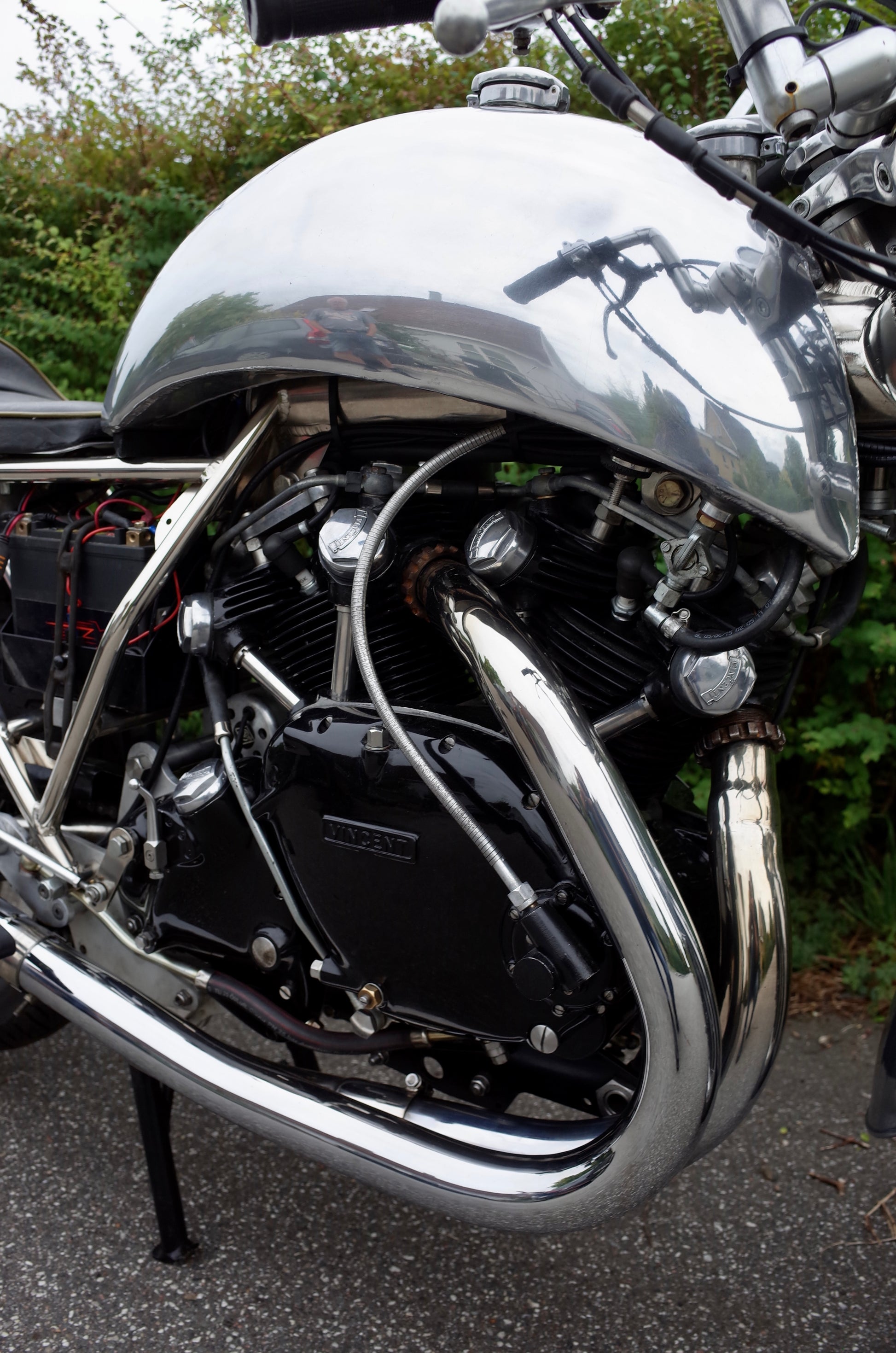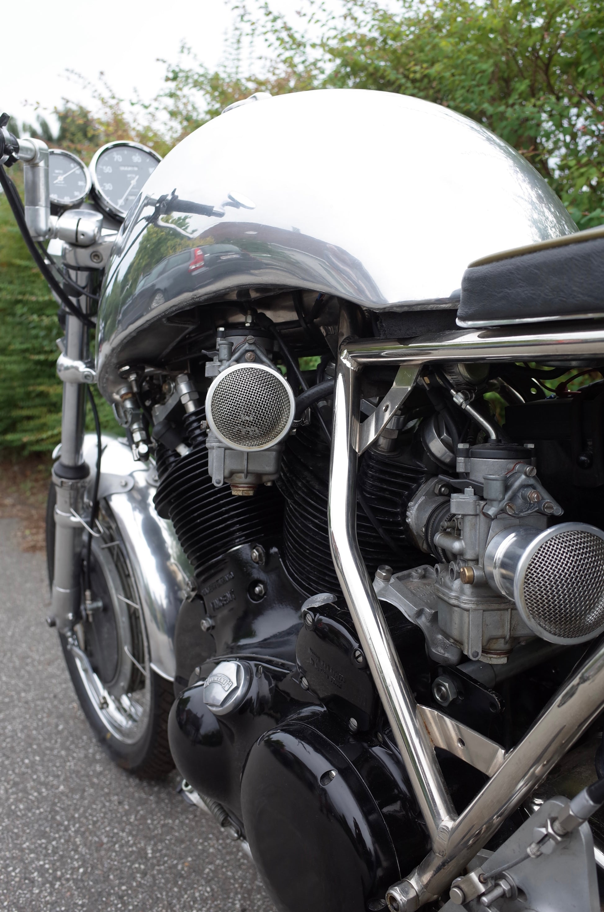 Two front cylinder heads are fitted, exactly as on the Vincent Black Lightning, positioning both carburetors on the left side.