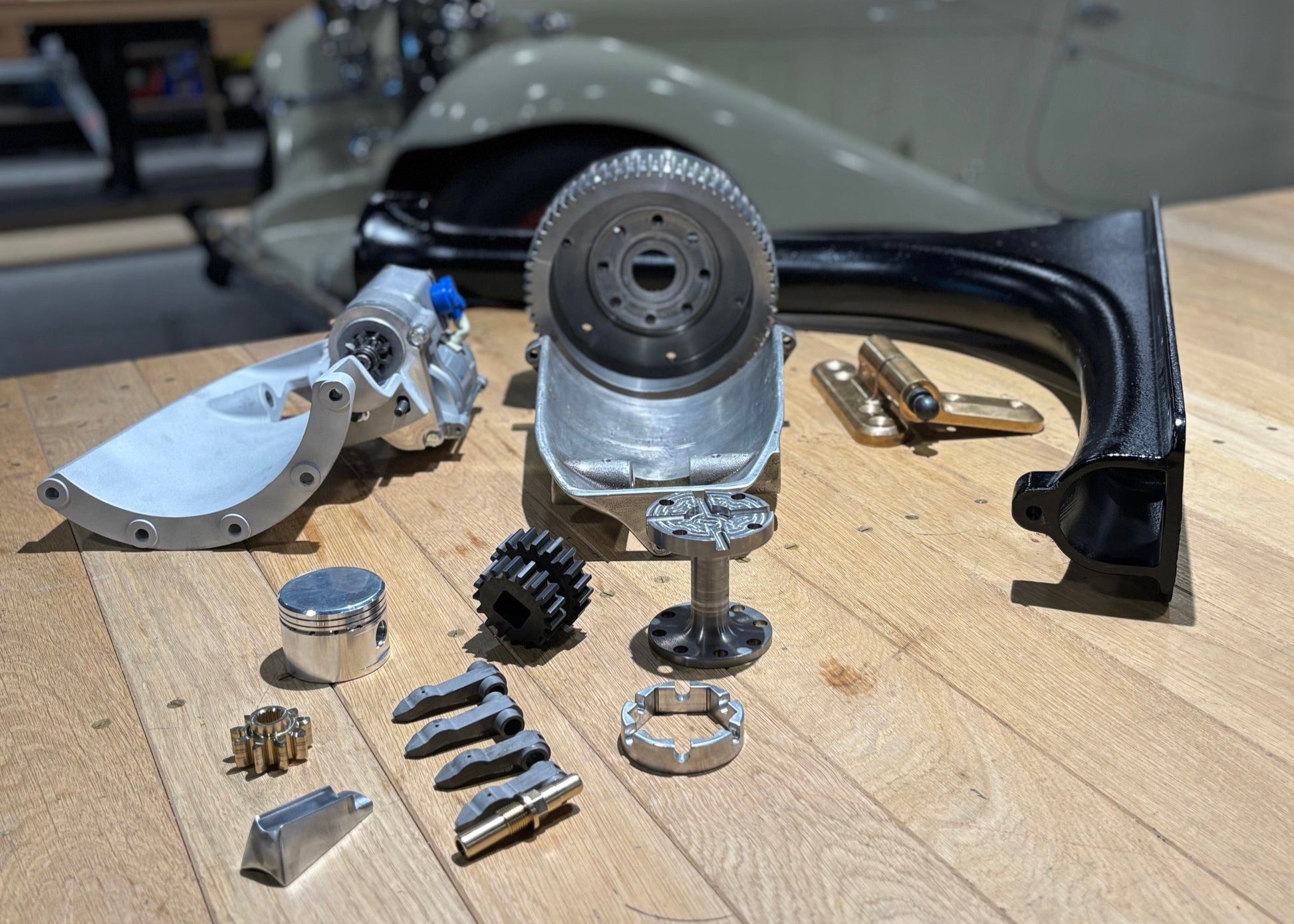 Quality Bugatti parts available: pistons, cam followers, valve guides, miscellaneous cogs, flywheel, electric starter unit, Type 41, 46 and 51 radiator caps as well as the Royale Elephant (with or without radiator cap) designed by Rembrandt Bugatti and faithfull recreations of Molsheim table legs, wheel racks and door hinges.