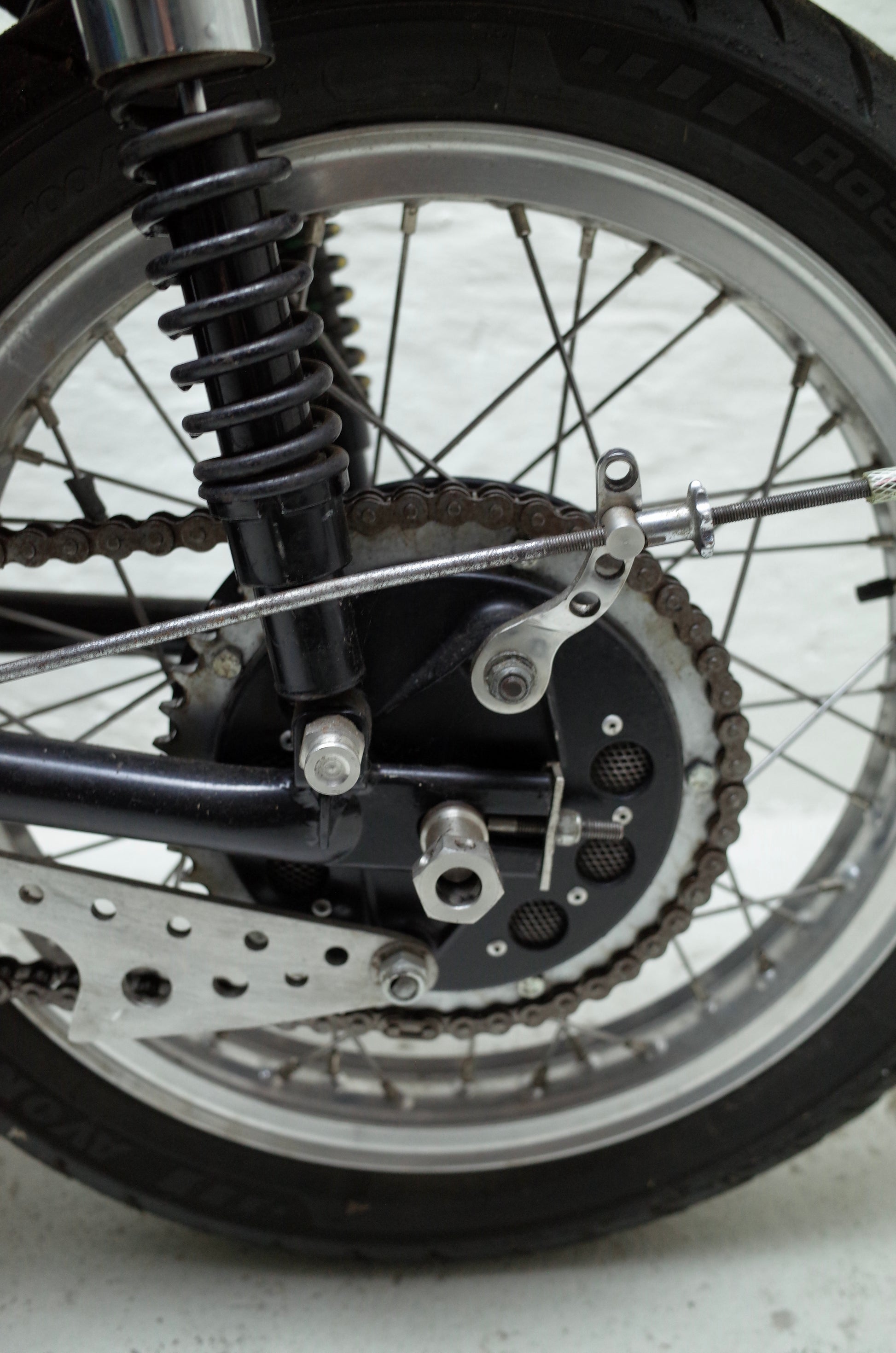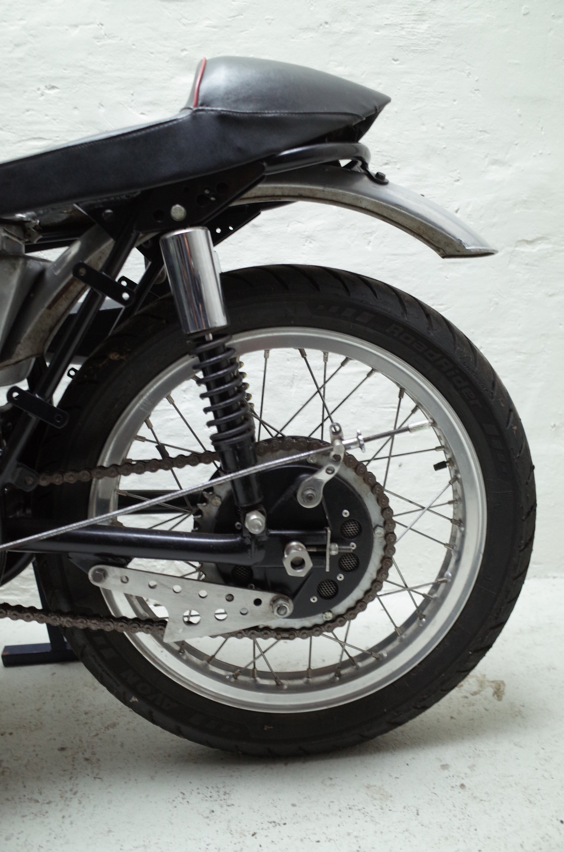 Original Manx conical hubs in magnesium front and back are laced to alloy rims. A Lucas racing magneto, rubber-mounted Smiths tachometer and full race fairing from the BeeBee racing staple complete the package.